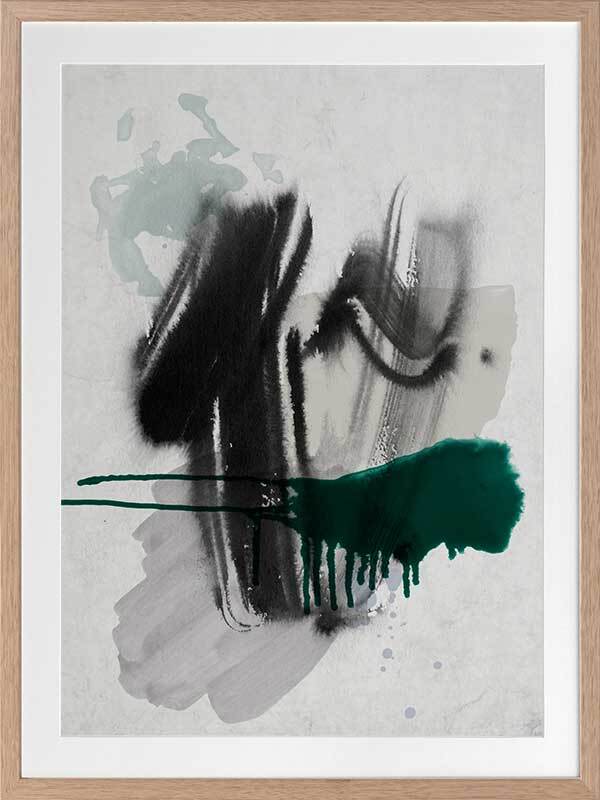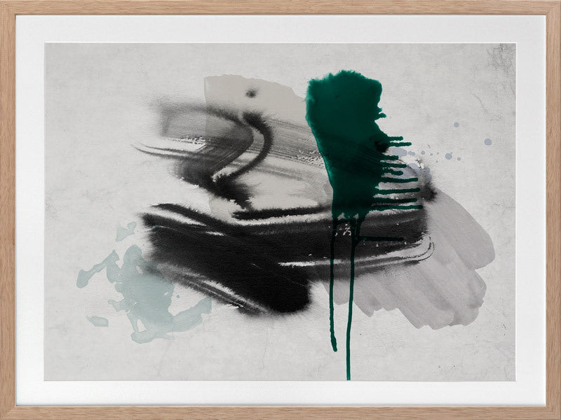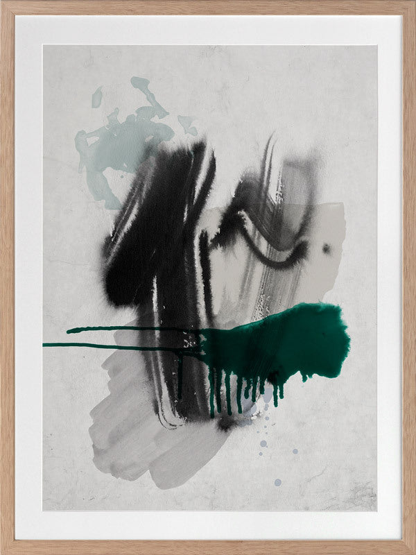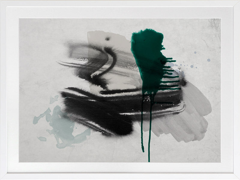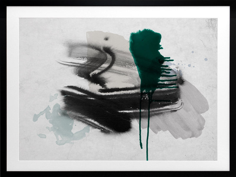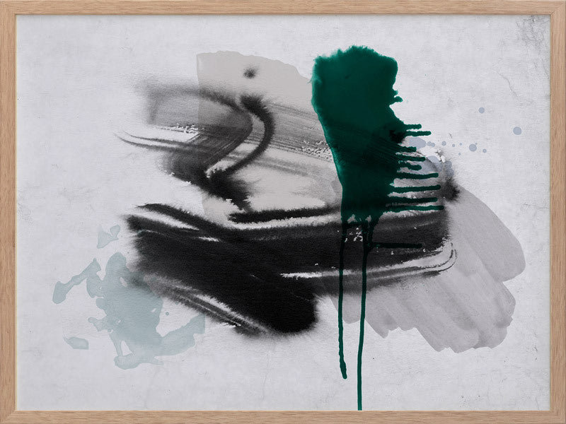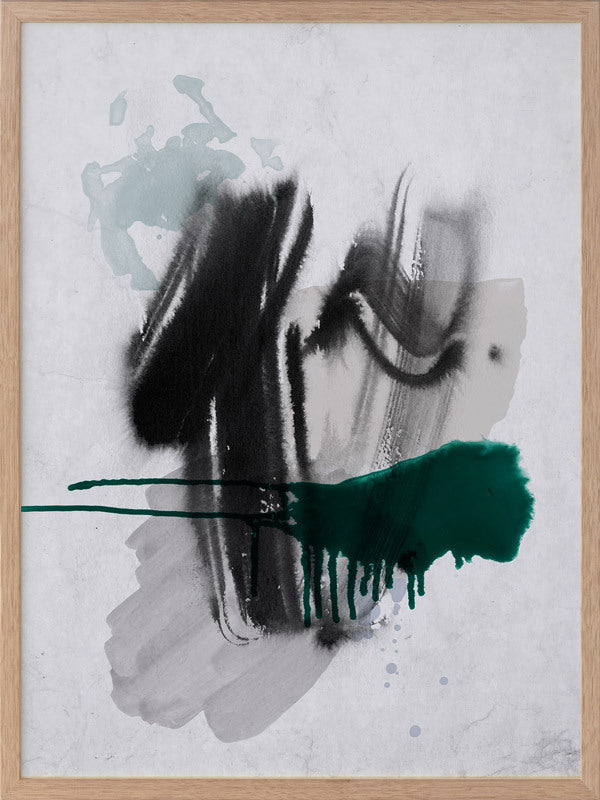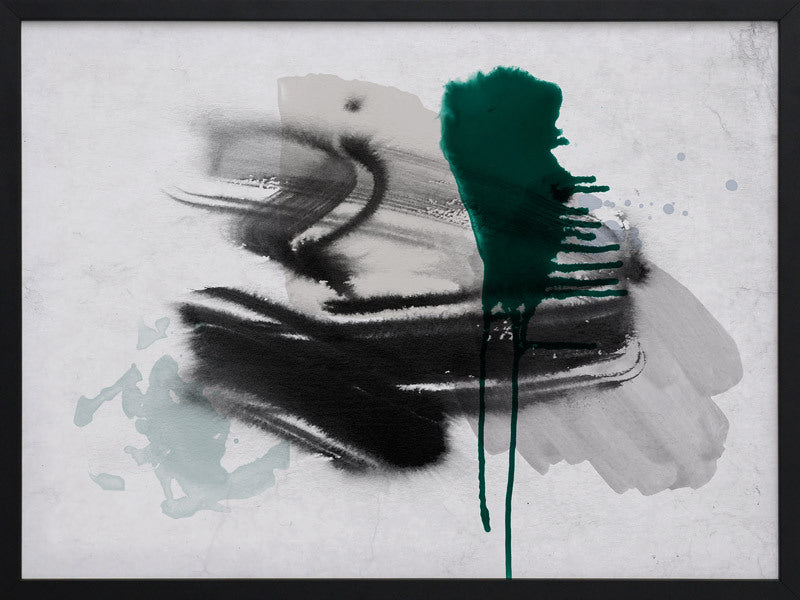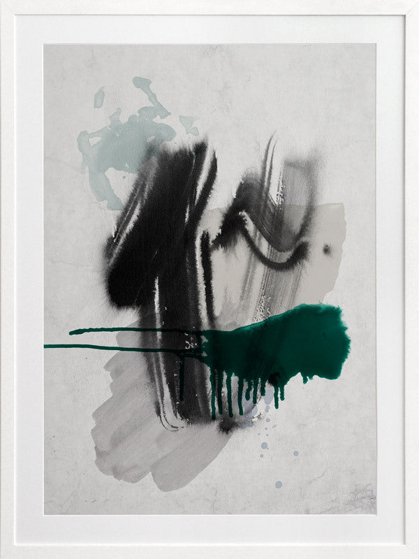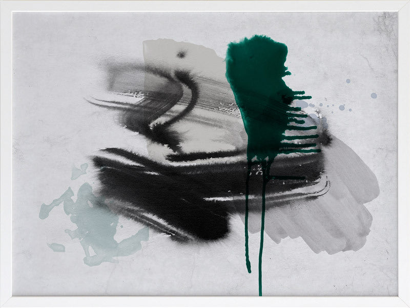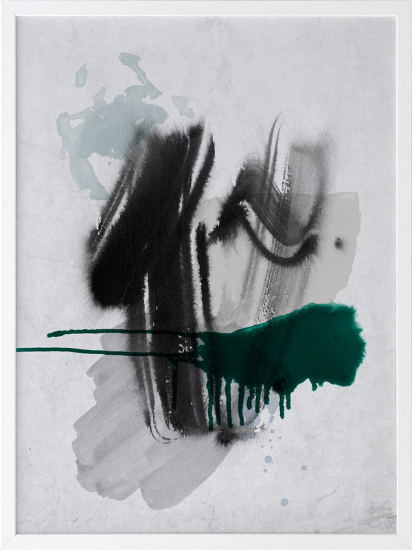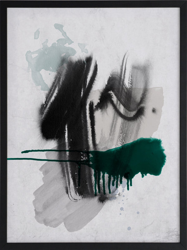 Astray I Framed Print: A grungy, textured artwork that features overlapping black, grey and jade green washes and strokes, against a textured grey background. Pairs with Astray II. 2019 SPRING/SUMMER COLLECTION: SOLSTICE