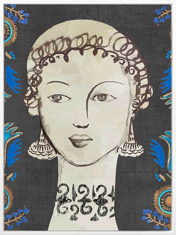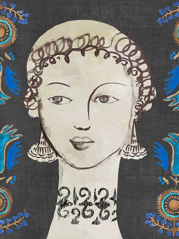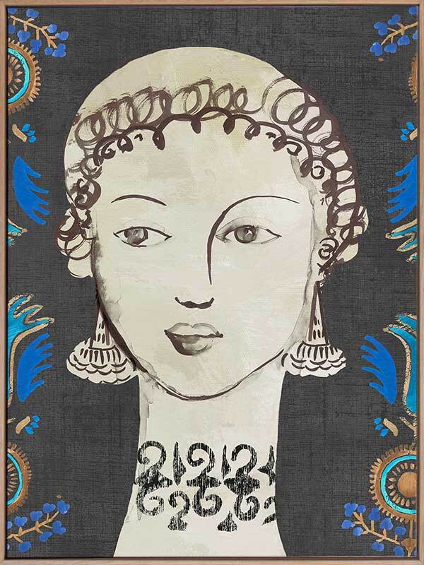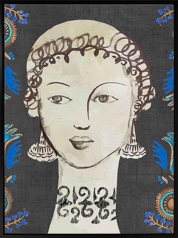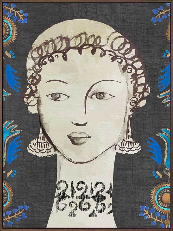 Astrea Canvas Art Print - With an eccentric edge, this playful piece instantly breathes character into any wall, featuring intricate details and organic brush strokes. Against greys, black and creamy beige, jewel-toned blues and gold burst to life, giving your space a sense of movement.