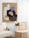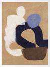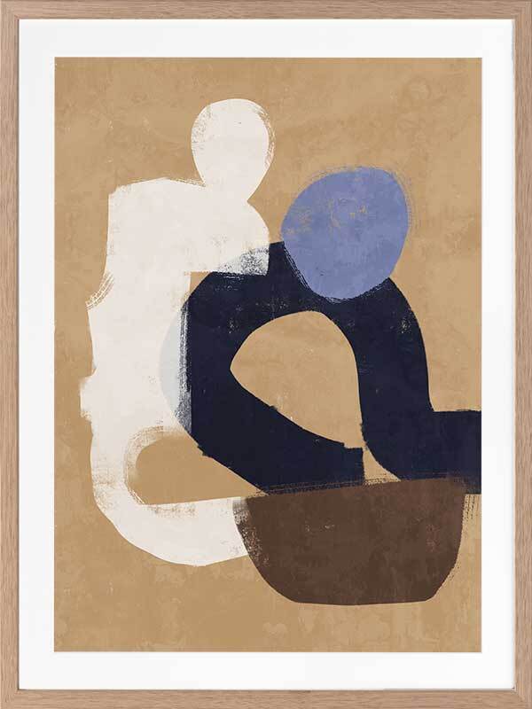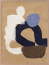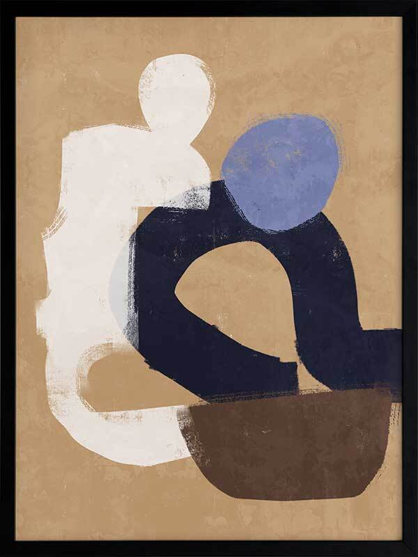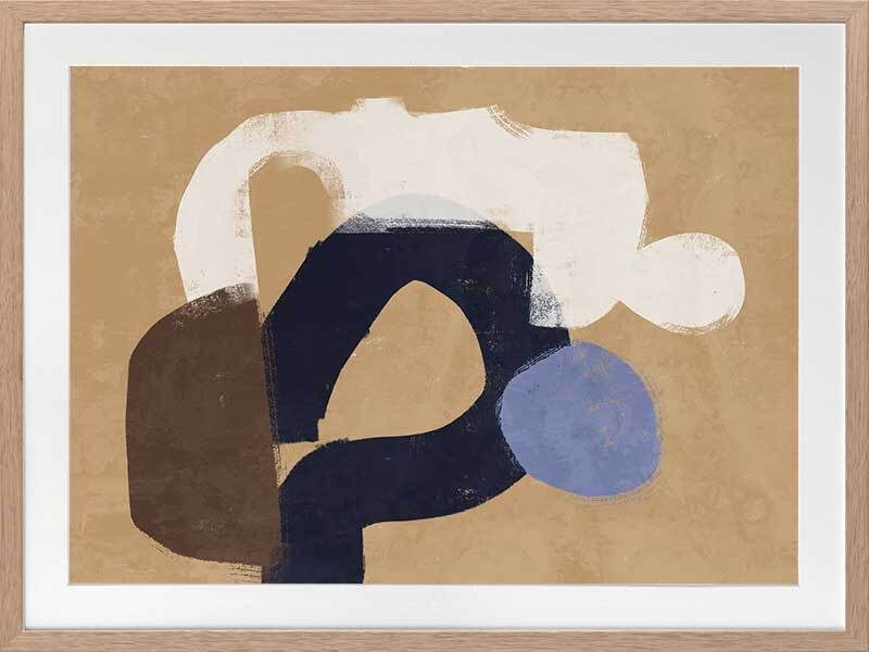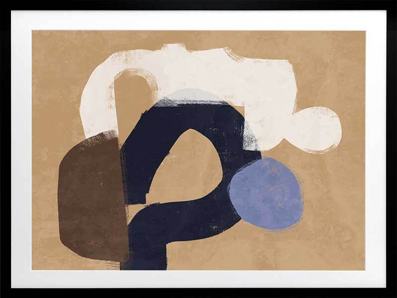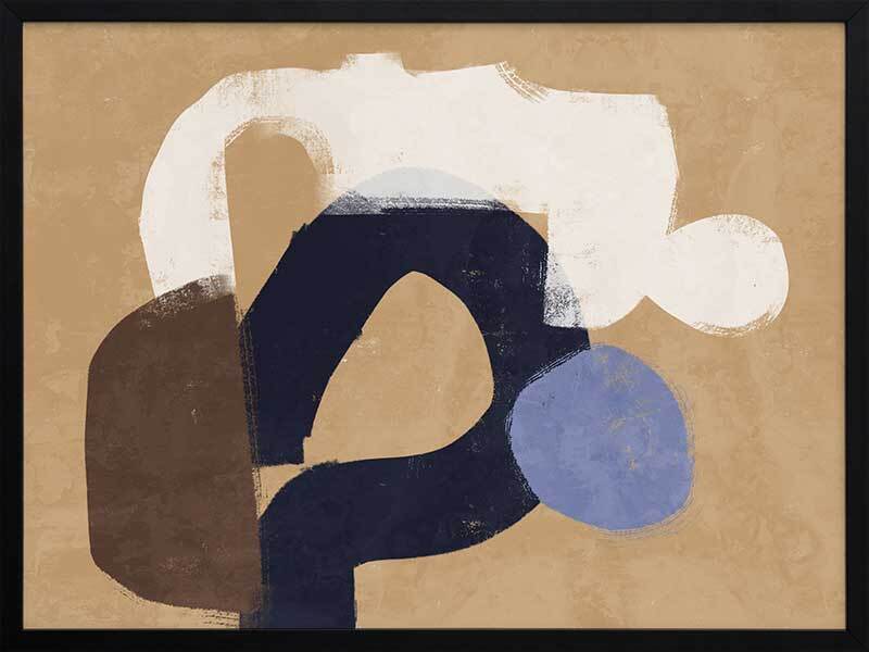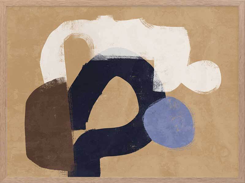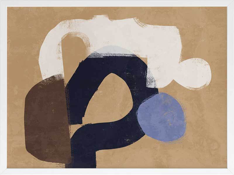At Ease Blue Framed Art Print - A beautiful abstract piece using visible brush strokes, carefully placed curved lines and circular shapes bring a sense of character to your space. A minimalistic palette includes navy blue and light blue, white, brown, and beige.