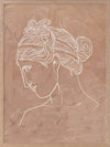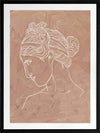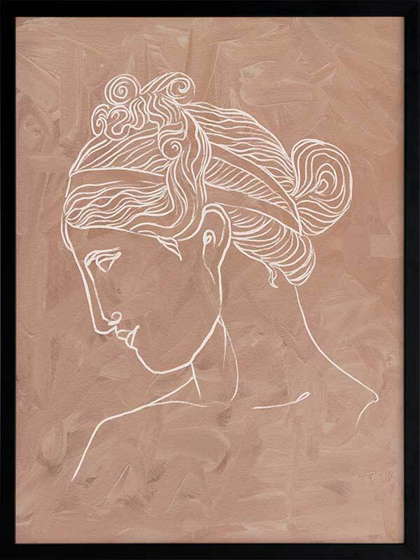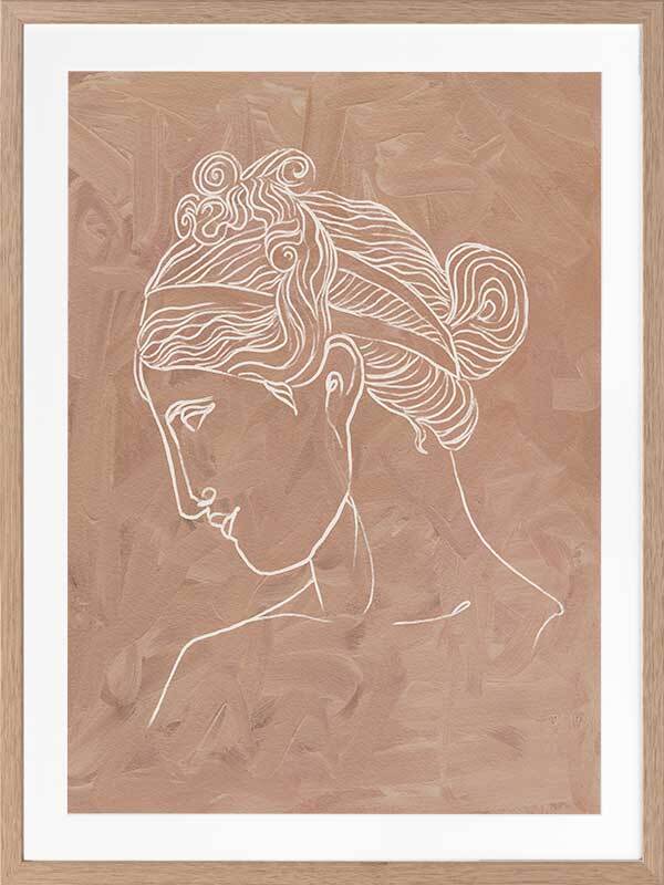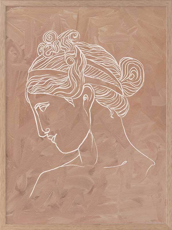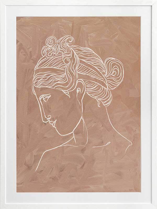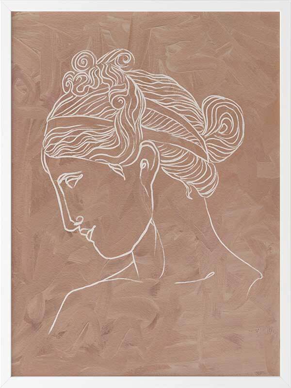 Athena Framed Art Print - Soft, whimsical and feminine, this simple line illustration captures the beauty of classical Greek historical etchings. Featuring an intricately painted female profile in a simple white line, against a textured clay coloured background. This piece can be matched with Julius to create a set.