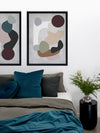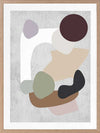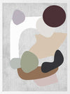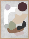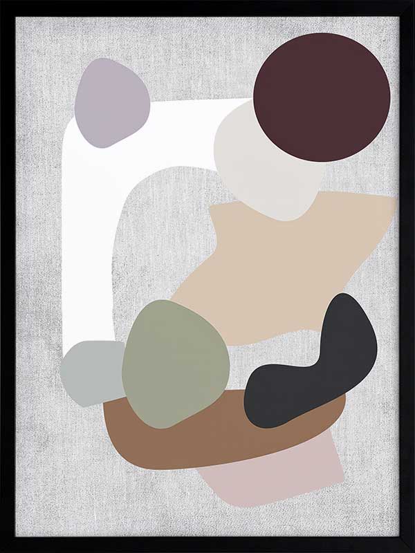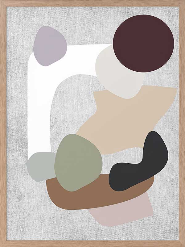 Atmos - A playful abstract artwork featuring soft, organic shapes in a muted colour palette of burgundy, lilac, brown and green against a grey textured background.