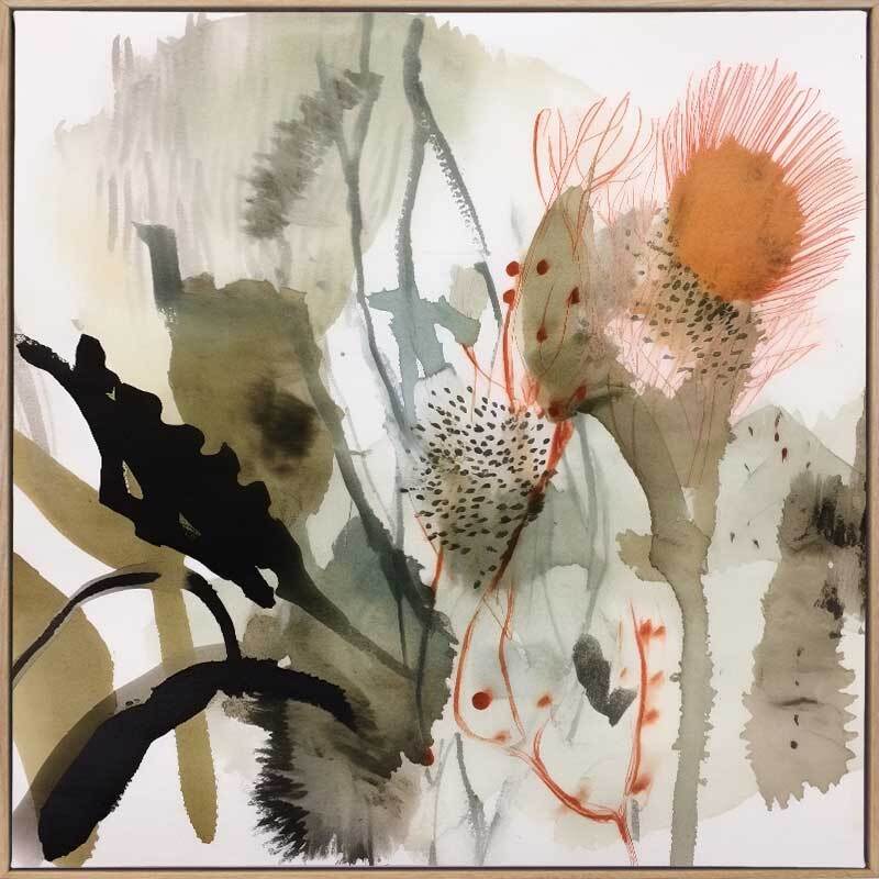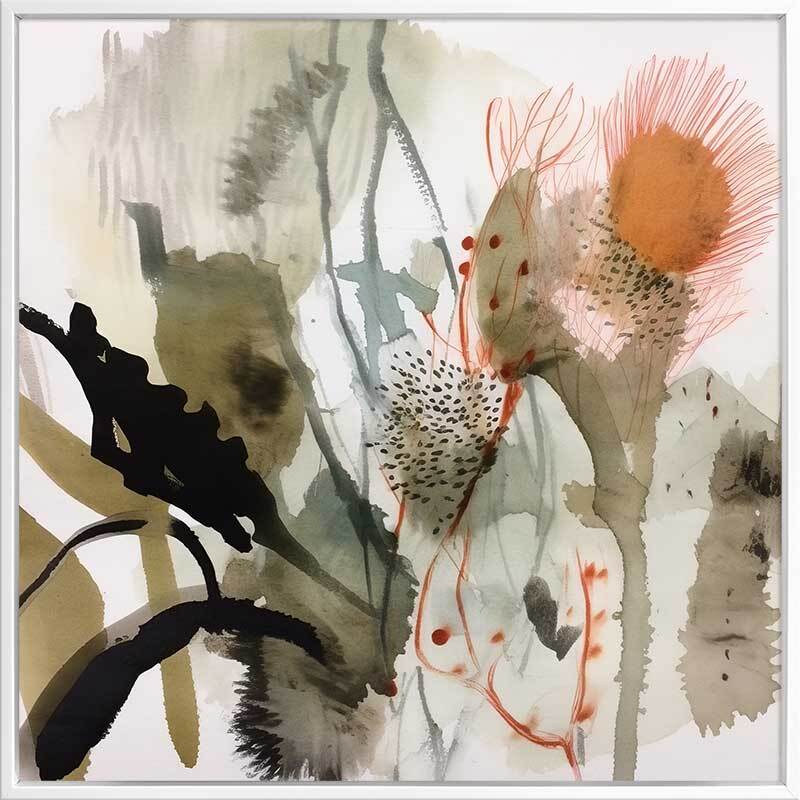 Aussie Florals Orange II Canvas Art Print - An orange bloom bursts with life amidst muted greens and earthy tones in this Australian floral and botanical painting. The combination of fluid brushstrokes and intricate line work creates a harmonious blend of softness and detail. Perfect for adding a touch of natural elegance to any room, this artwork evokes a sense of organic beauty and serenity.
