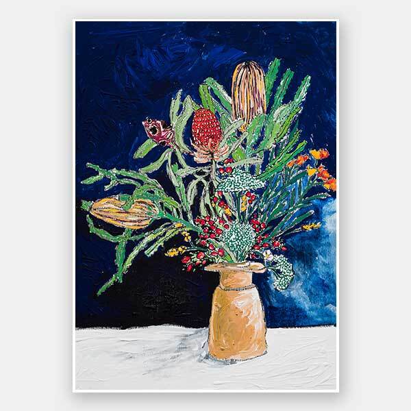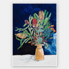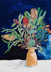 Australian Wildflower Bouquet - A floral still life arrangement sits on a white table against a deeply textured and tonal background of navy blue. The bouquet features Australian natives, foliage and Banksias painted in red, orange and green tones beautifully displayed in an earthy orange vase. The acrylic painted art print is striking in colour, texture, and shape. Lara Meintjes is a US-based, South African painter who isn't afraid to experiment mixing bold colours with soft floral imagery. The depth of creativity in her pieces inspires you to find the calm within the chaos.