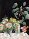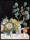 Australiana Canvas Art Print - A soft still life featuring vasefuls of pastel-coloured florals and foliage contrasted against a black background.
