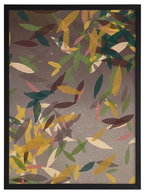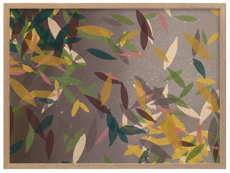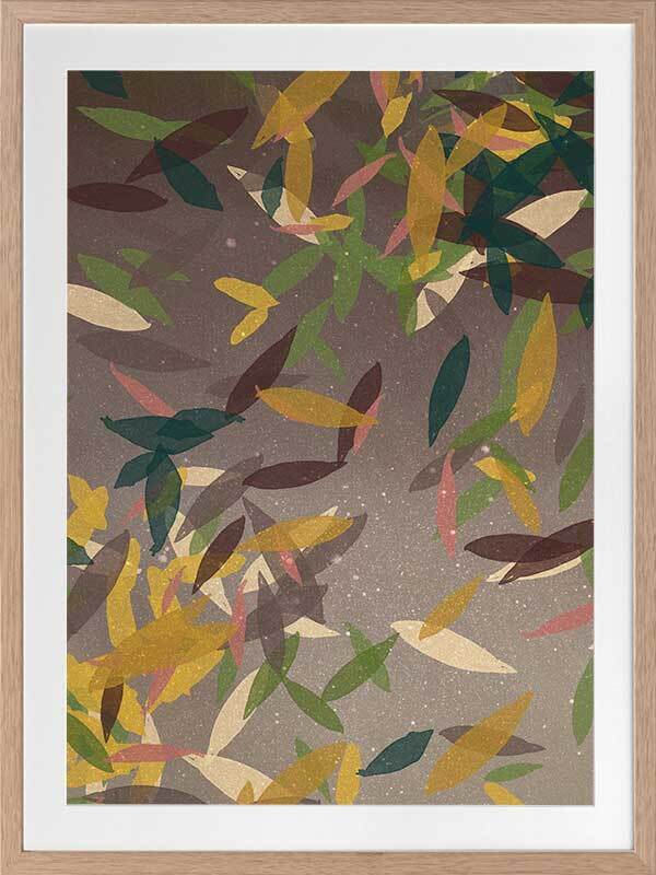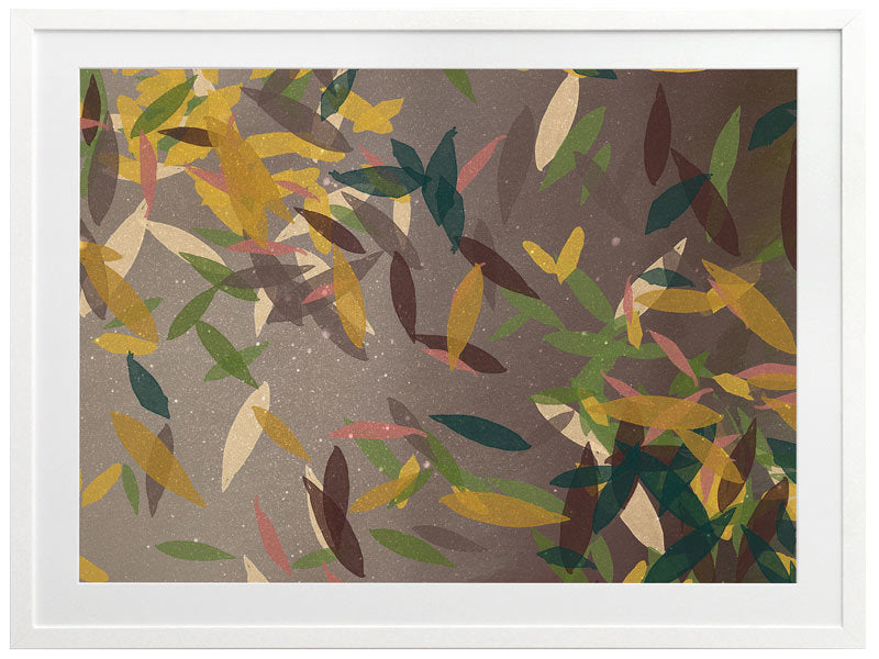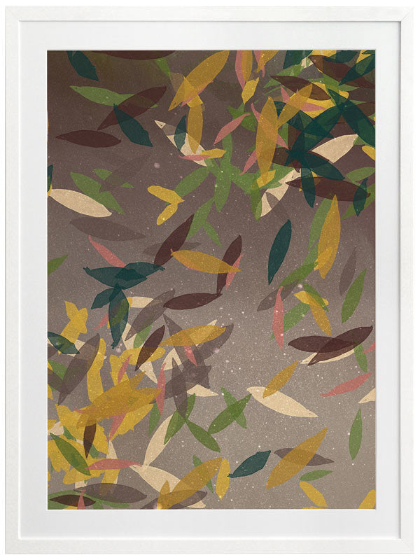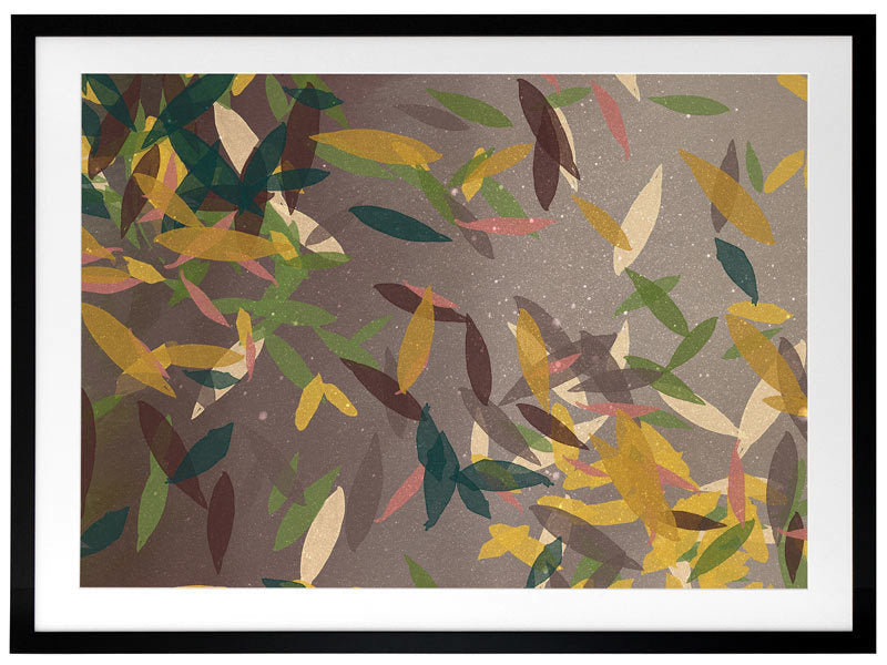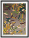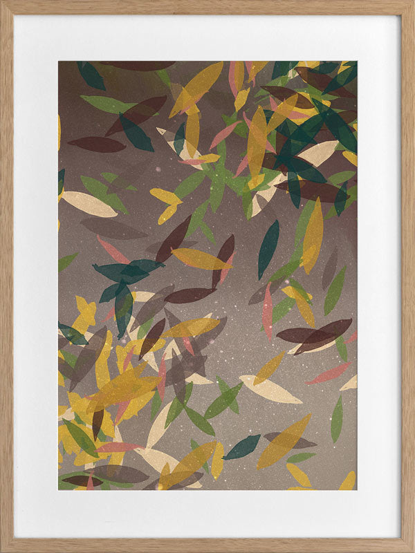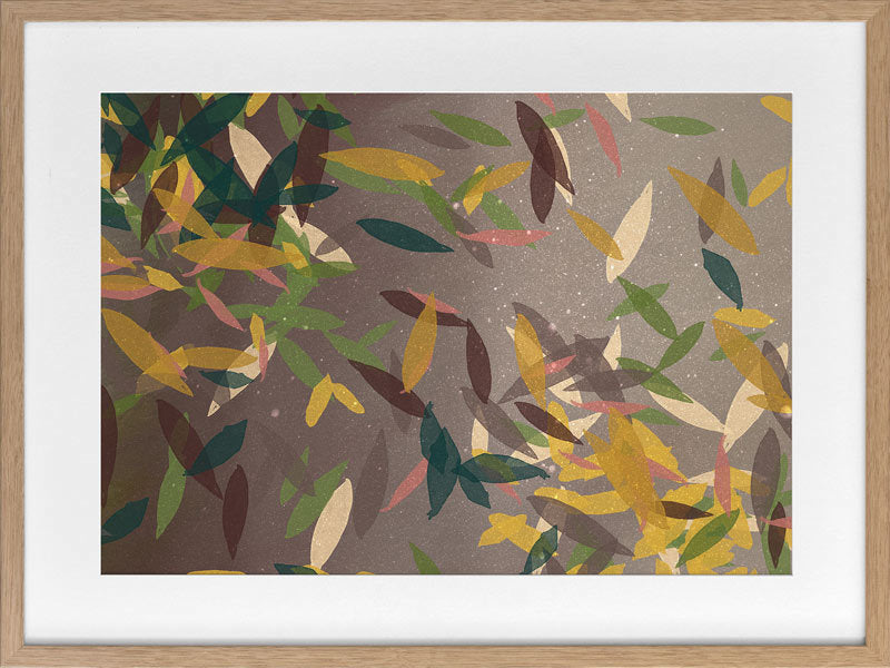 Autumn Rain Framed Print: A beautifully textured artwork, featuring falling leaves in a warm brown colour palette, with pops of yellow, green and cream. 2018 SPRING/SUMMER COLLECTION: REMINISCE