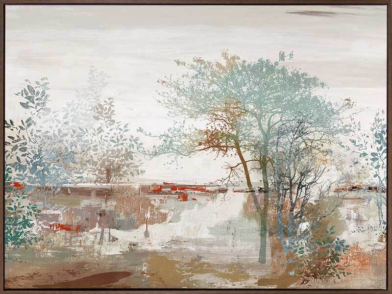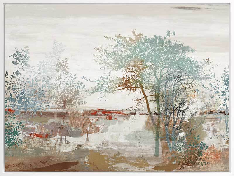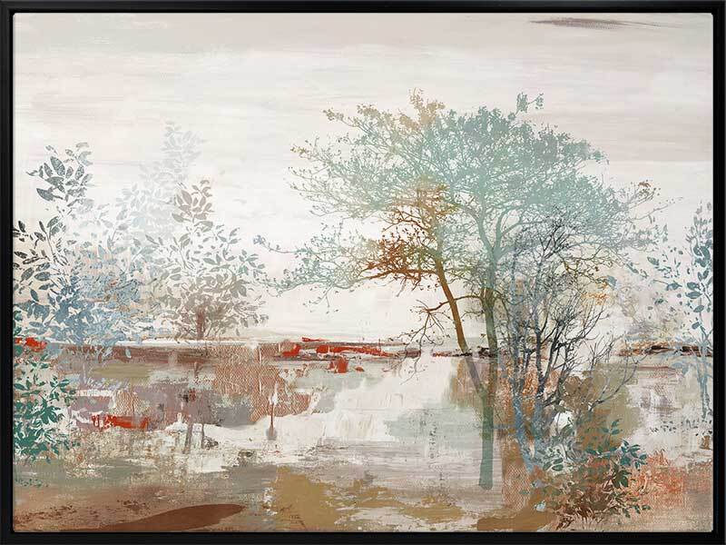 Autumn Silence Canvas Art Print - Featuring wispy brush strokes and faded colours, this piece has a magical feel to it, breathing energy into your space with its foliage inspired imagery and soothing palette. Soft blues, greens, browns, yellows and red sit in front of a soft white background, making this a beautiful piece for any interior style with its comforting autumnal feel.