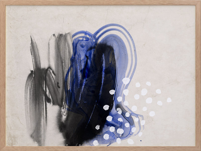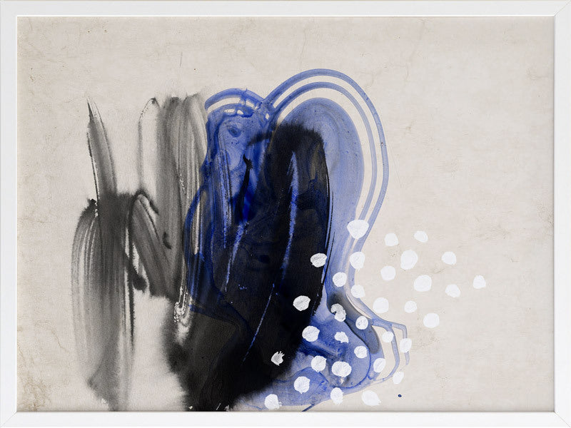 Awash I Framed Print: A soft, delicate abstract featuring washes of black and electric blue overlaid with white dots, against a grungy neutral background. Pairs with Awash II. 2019 SPRING/SUMMER COLLECTION: SOLSTICE