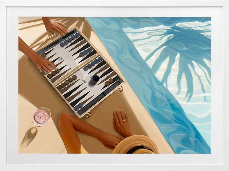 Backgammon, Anyone Framed Art Print - Set poolside in a Palm Springs-inspired oasis, two hands move pieces across a backgammon board while the sun casts playful shadows of palm trees on the water. This limited edition art print brings to life a day of games, fashion, and effortless sophistication, embodying the leisurely spirit of luxury. Cool, muted tones of the pool contrast with the warm, golden hues of the pool deck, creating a balanced, relaxed mood that draws you in. Retro elements and the sense of effortless fun make this the perfect wall art for a living room or bedroom, bringing both warmth and refinement into any interior design style. Part of Interior Designer Shaynna Blaze's exclusive designer collection, this piece radiates personality and charm.