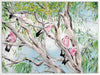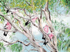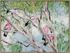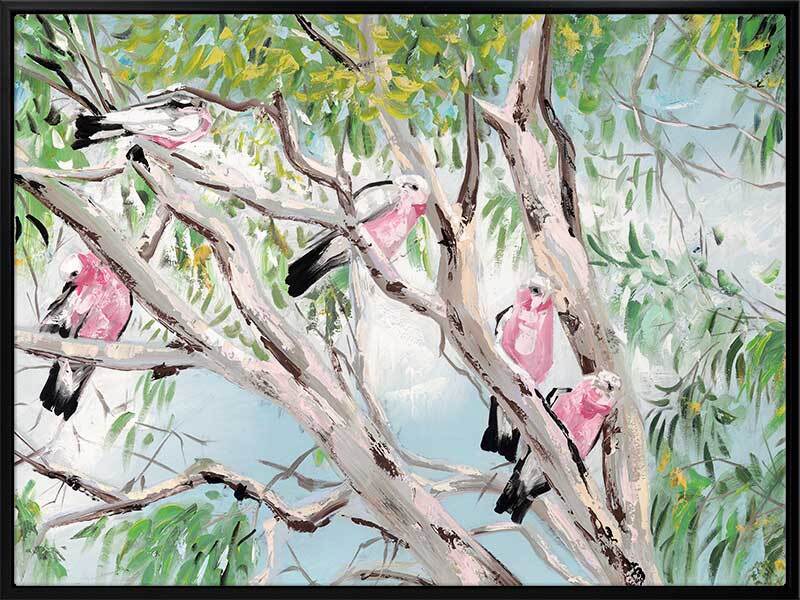 Backyard Buddies Canvas Art Print - A group of pink galahs sit in the branches of a beautifully textured gum tree against a soft blue sky.