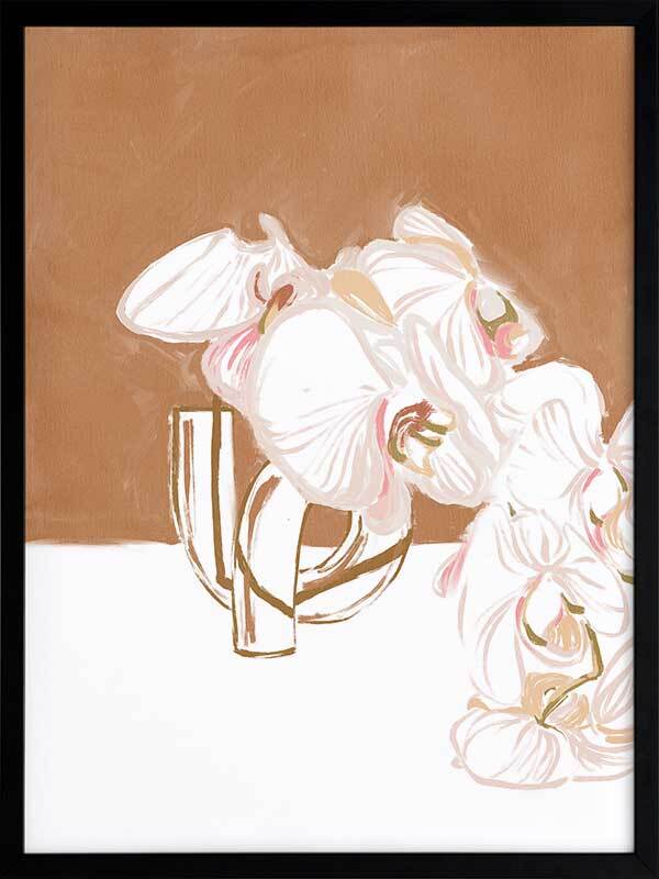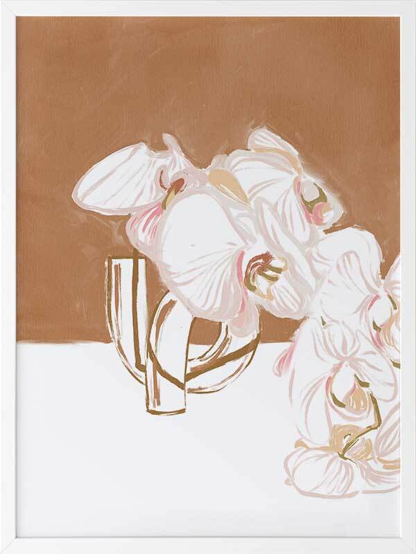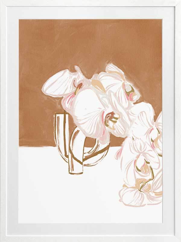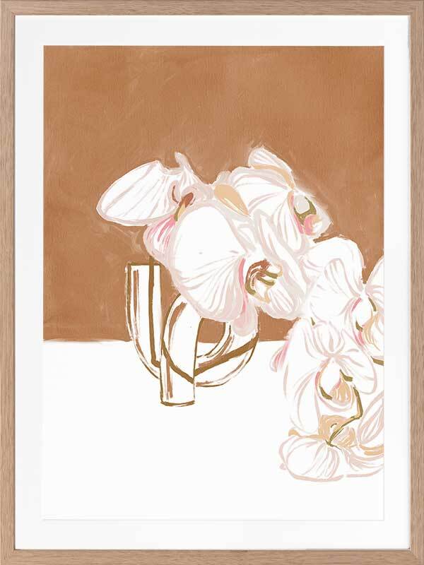Balmy I Framed Art Print - Bring back memories of relaxing getaways with the simple, understated energy of this vase of blooming flora, held by our dreamy Wander Glass Vase, playing with perspective as the flowers fall in the foreground, drawing the eye in and creating more interest. Featuring minimal details and linework, with a monotone palette of warm brown, soft pink and white, this piece is easily incorporated into any interior style.
