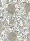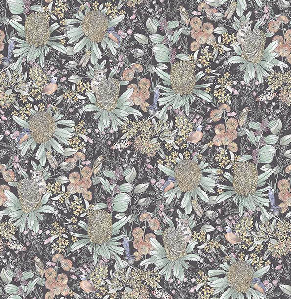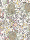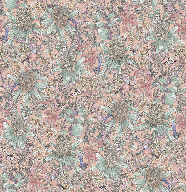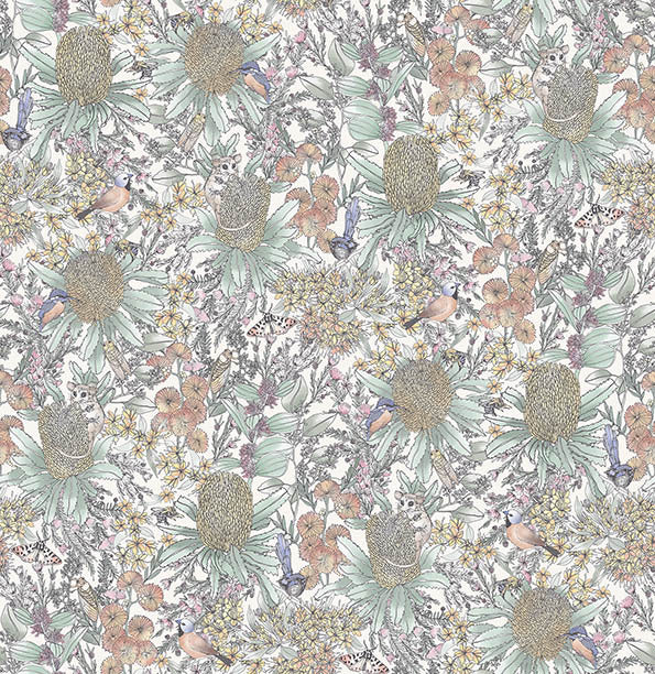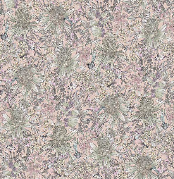 Banksia and Myrtle Wallpaper - Your eye will discover something new every time with this highly detailed wallpaper design, featuring a family of banksia and myrtle wildflowers, bursting with colour and sweet smells. Hidden among the careful chaos you'll find some curious pygmy possums joined by other little birds and butterflies. Choose from violet, ecru, cherry blossom, peachy, liquorice and neutral.