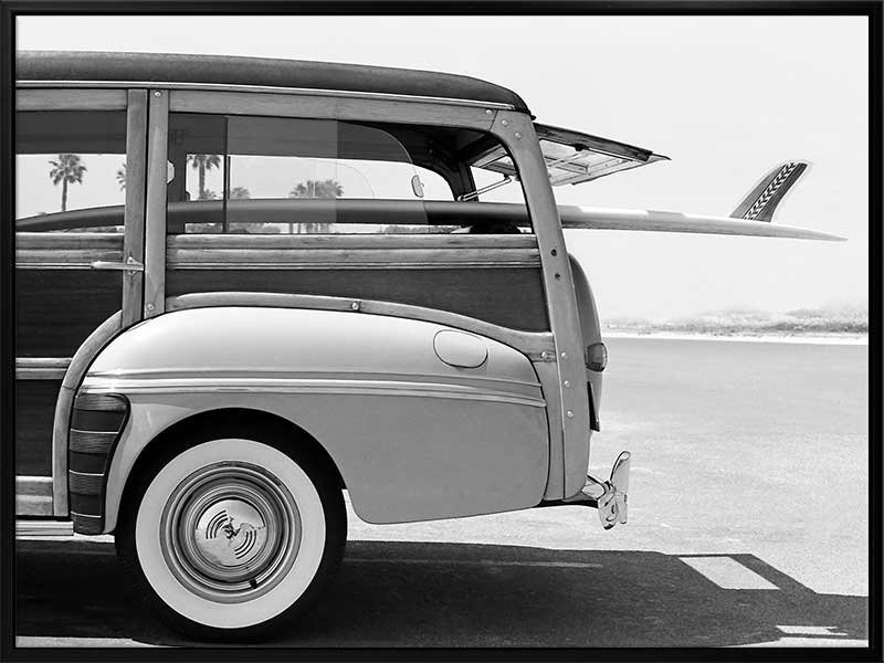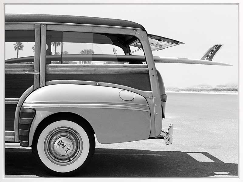 Barbara Ann - This quirky, vintage black and white photograph features a surfboard hanging out the boot of a retro beach wagon.