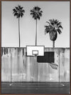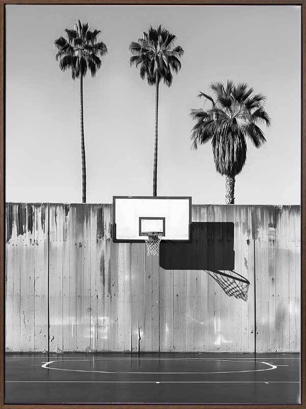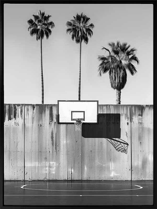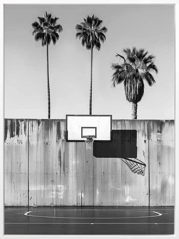 Beach Ball Canvas Art Print - This black-and-white photographic cityscape wall art is the perfect way to bring vintage vibes to a space, capturing the essence of urban life. With a basketball court framed by palm trees, this piece adds a calm playfulness to any room.