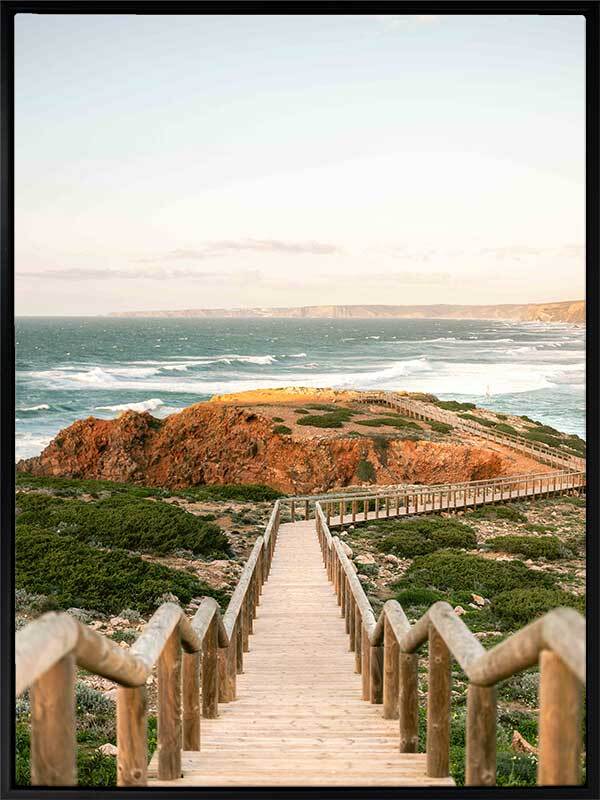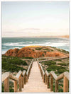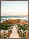 Beach Boardwalk Canvas Art Print - Add depth to any space with this coastal photographic wall art, featuring a never-ending boardwalk at the beach. With its vintage photography vibes, this art print brings warm energy with orange, beige, green, and blue shades.