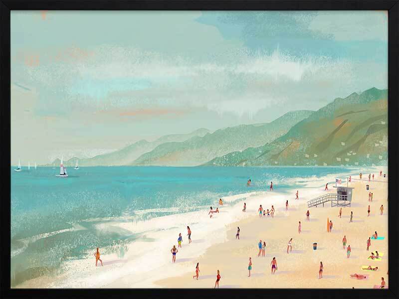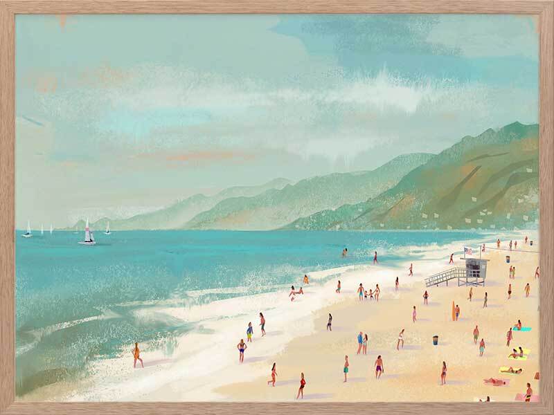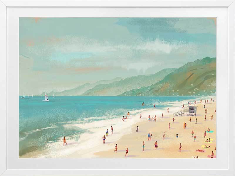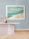 Beach Daze Framed Art Print - The water's warm - let's go for a dip! With a backdrop of green hills and blue hazy skies, this beach scene is idyllic. Sailing boats sit patiently on the aquamarine waters whilst their passengers wade through the water and stroll on the sandy beach. A perfect beach colour palette combined with a textural painterly style brings coastal dimensions into your space.