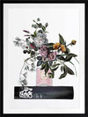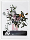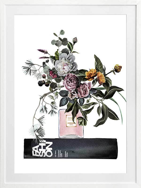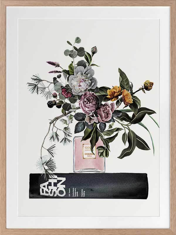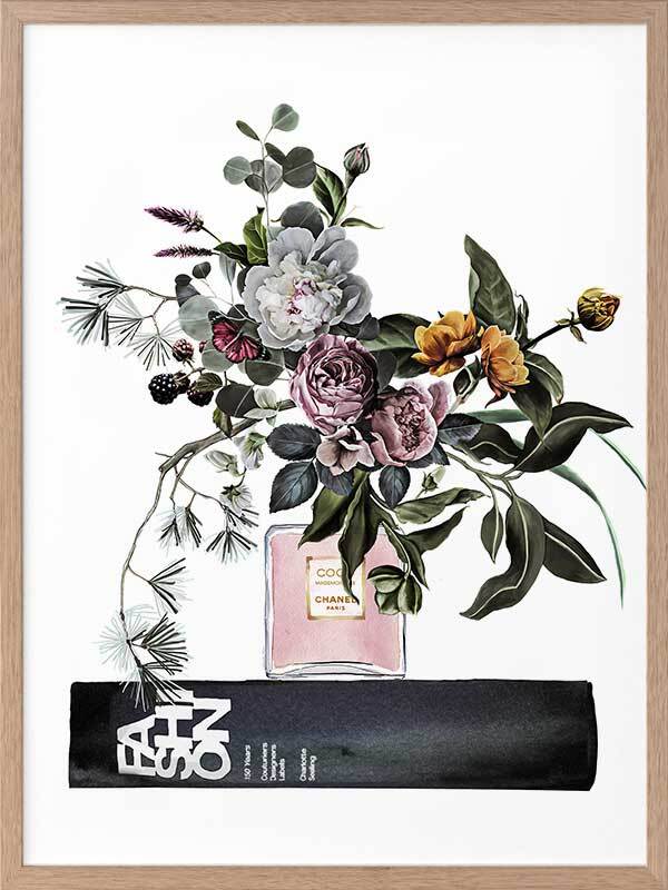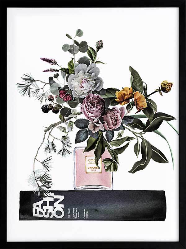 Berry Bliss Framed Art Print - If you could see what a bottle of Chanel perfume smells like, it would look just like this. A luscious bouquet of flowers burst from this blush pink Chanel bottle, sitting atop a vintage fashion book. Rich colours of dark green, rosy pink, golden yellow, and deep black contrast the stark white background, making this piece ideal for any interior style.