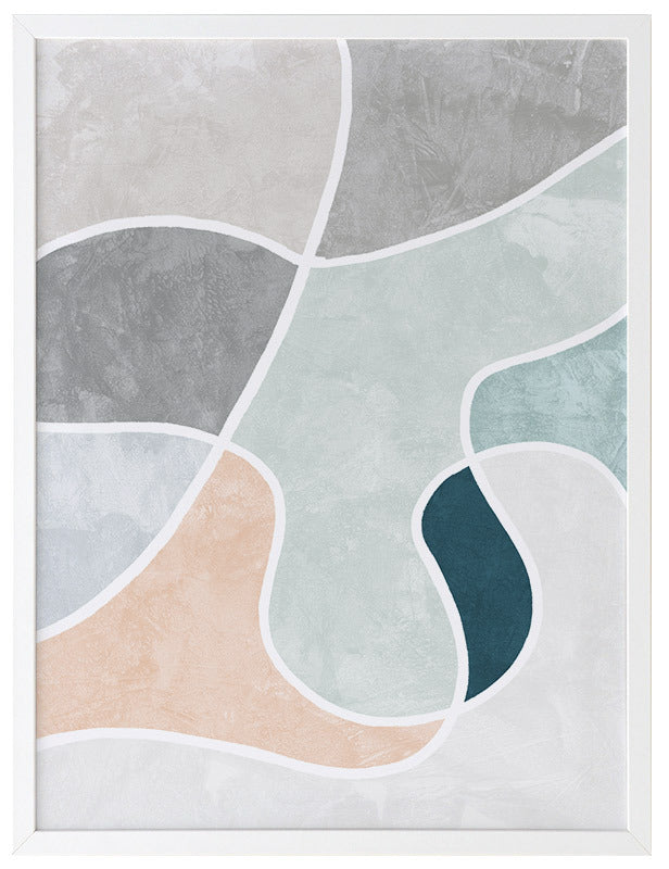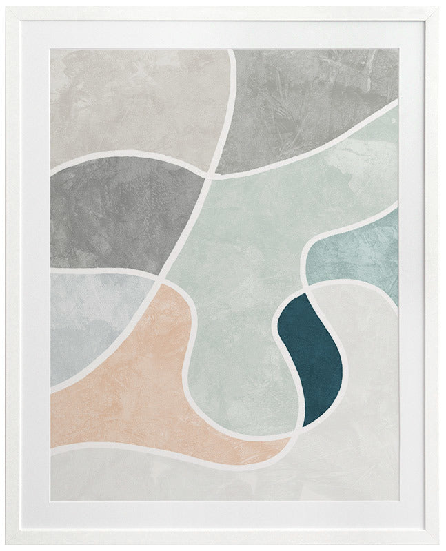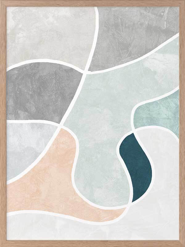 Betty Framed Print: A retrospective minimalistic artwork that explores overlapping geometric shapes and forms in pale blue, grey and blush. Companion piece to Peggy. 2018 AUTUMN/WINTER COLLECTION: CONTINUUM