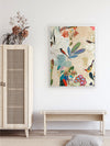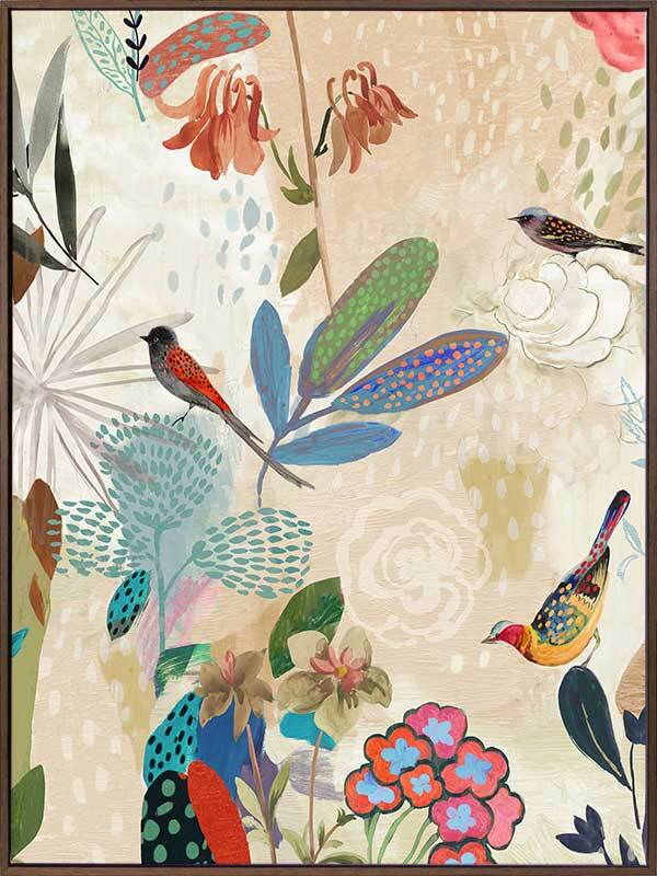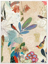 Birdsong I Canvas Art Print - Embellish your wall with this glorious abstract depiction of a floral wonderland. Brightly coloured birds gather to explore their surrounds, with vibrant pinks, greens, blues, yellows and reds against a soft beige and white backdrop.