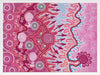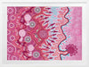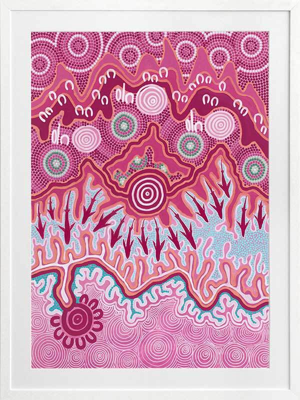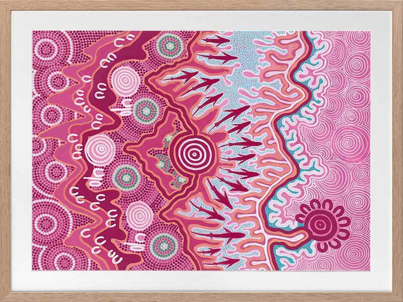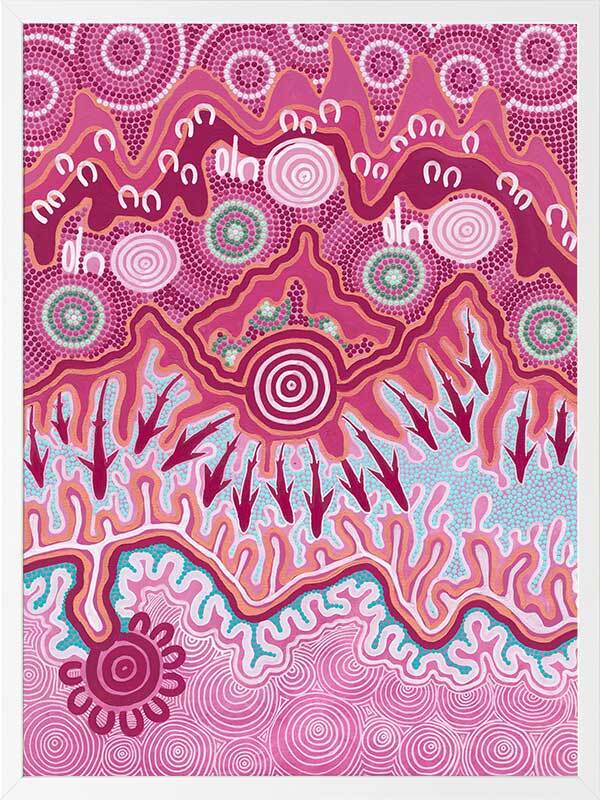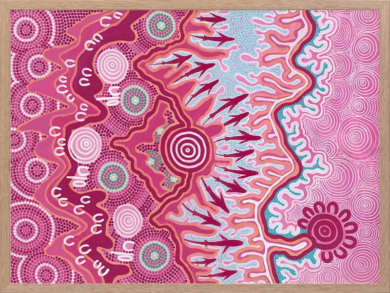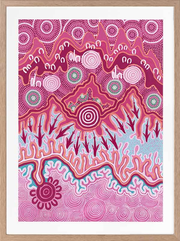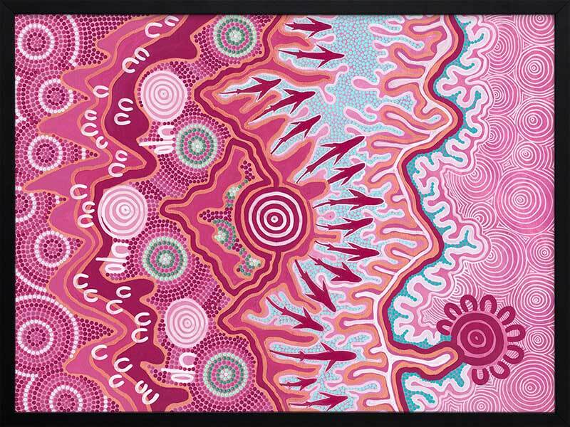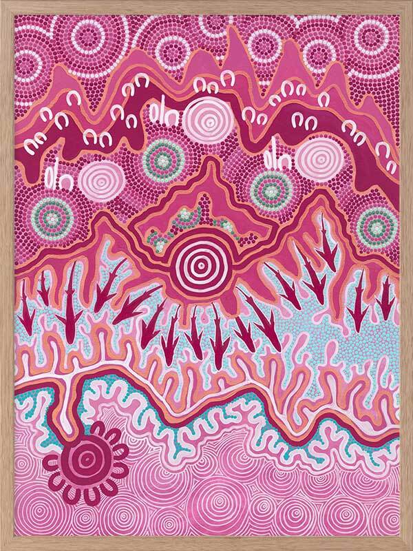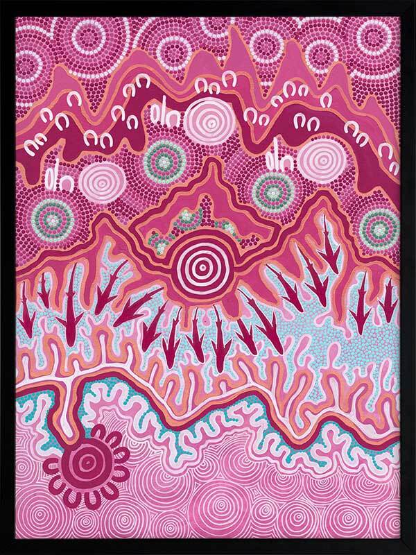 Birrbay Connection Framed Dark Pink Art Print - Elaborate and detailed, this spectacular Aboriginal Wall Art features meticulously placed lines, dots and circles using traditional techniques by a local Aboriginal Artist. This piece will transform your room with a breathtaking design that adds depth and interest to your space with an adventurous feel. A bold palette of dark pink, blush pink and light blue tones makes this Aboriginal Art print a statement piece to brighten any space.