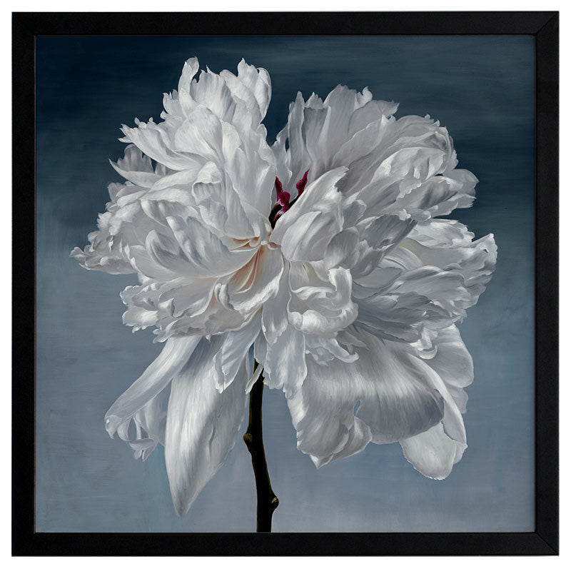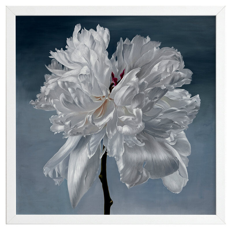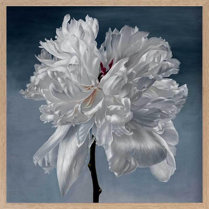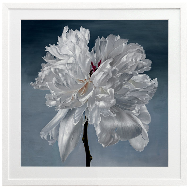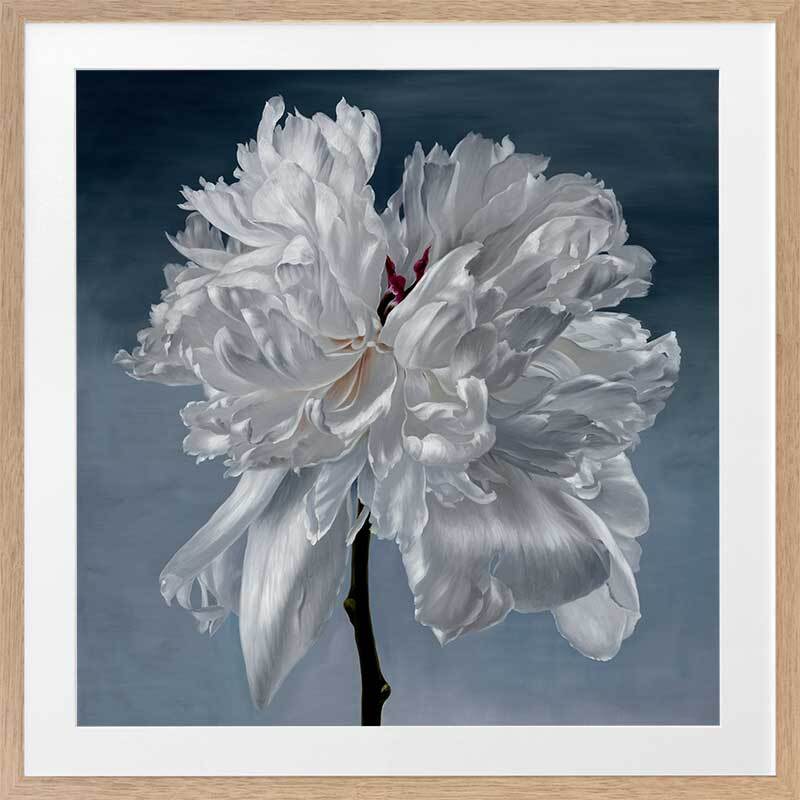 Blomst Framed Print: Soft, white petals adorn an oil-painted peony on a dark blue background. 2018 AUTUMN/WINTER COLLECTION: CONTINUUM