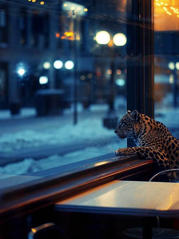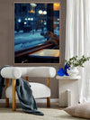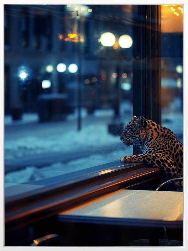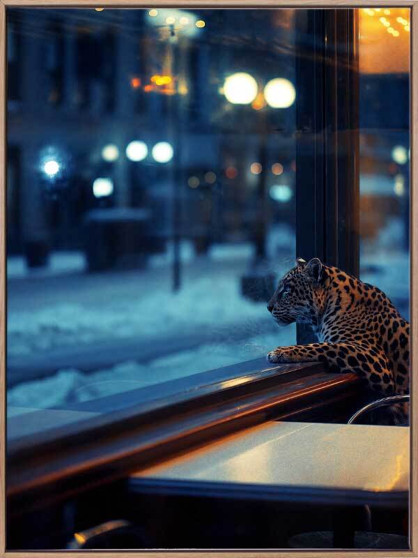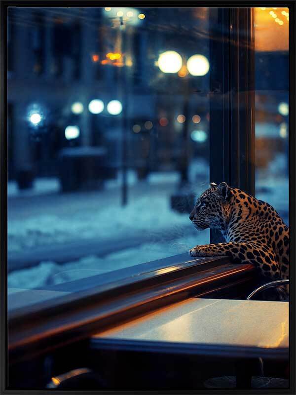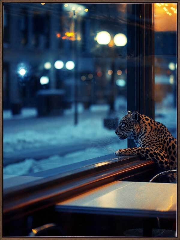 Blue Hour Canvas Art Print - A leopard peers out a window, set against a dreamy city nightscape in this photographic artwork. Bathed in blue hues with hints of warm yellow light, the scene evokes a surreal, mysterious atmosphere. The unique mix of wildlife and urban elements gives this wall art an abstract, retro quality. Ideal for adding a touch of Palm Springs art decor flair to a living room or bedroom, this piece brings the enchantment of mid-century modern design into your home.
