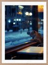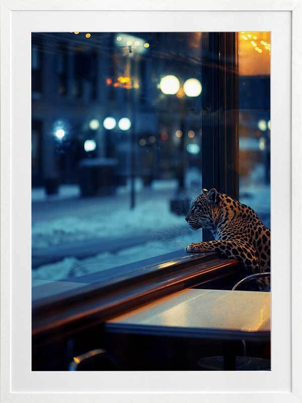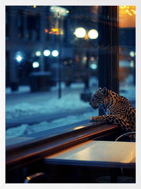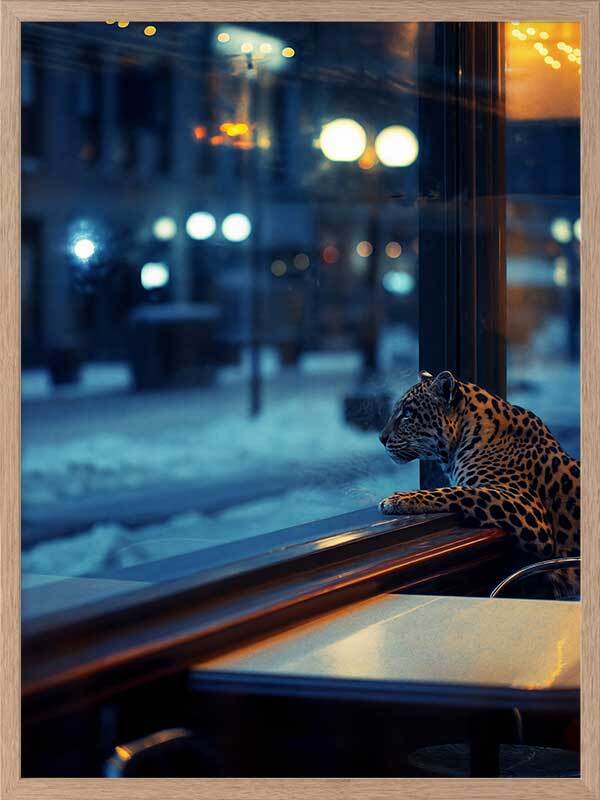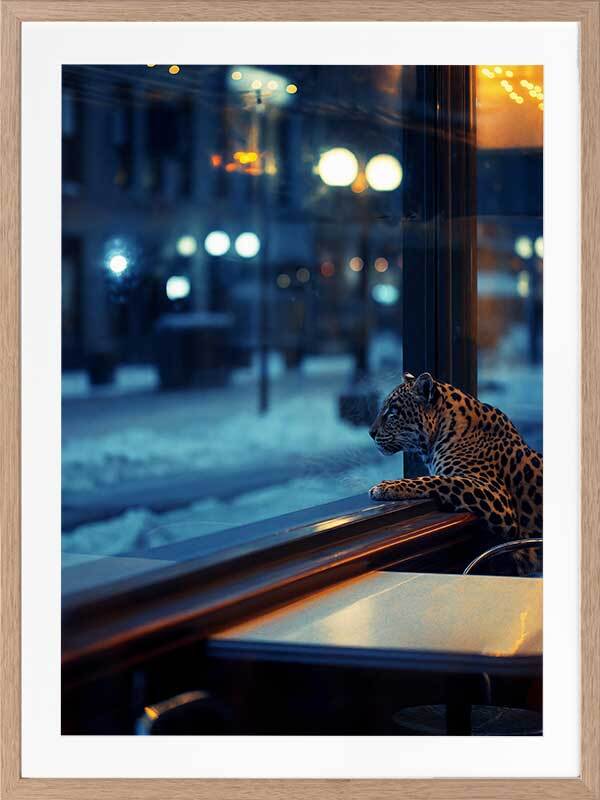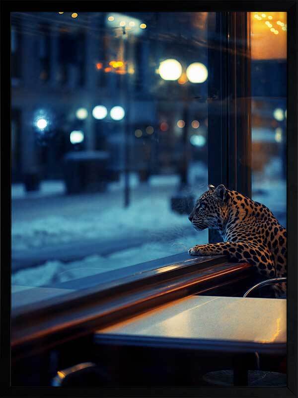 Blue Hour Framed Art Print - A leopard peers out a window, set against a dreamy city nightscape in this photographic artwork. Bathed in blue hues with hints of warm yellow light, the scene evokes a surreal, mysterious atmosphere. The unique mix of wildlife and urban elements gives this wall art an abstract, retro quality. Ideal for adding a touch of Palm Springs art decor flair to a living room or bedroom, this piece brings the enchantment of mid-century modern design into your home.