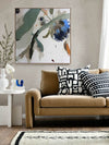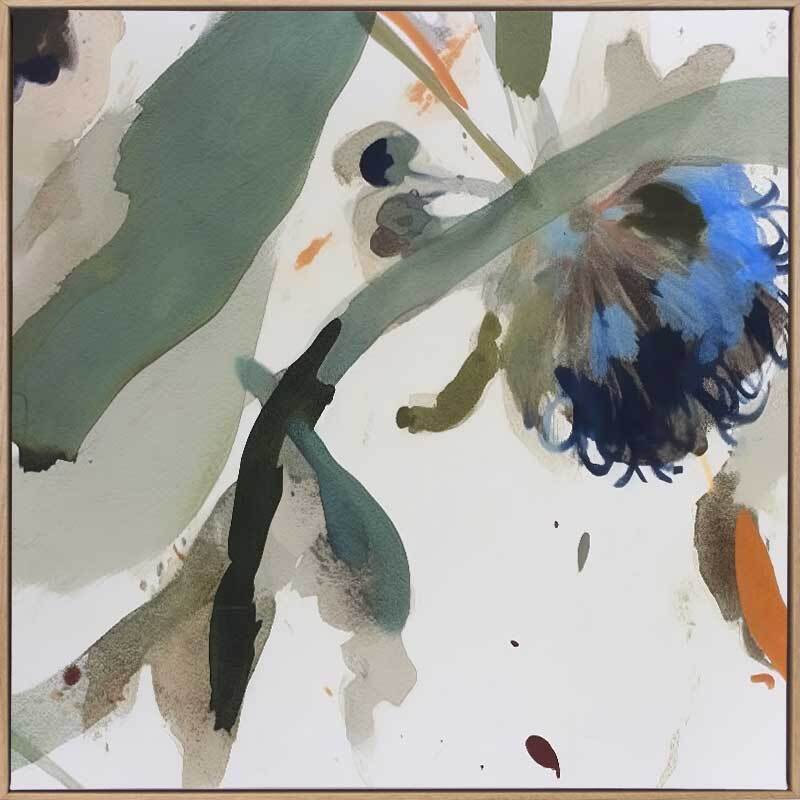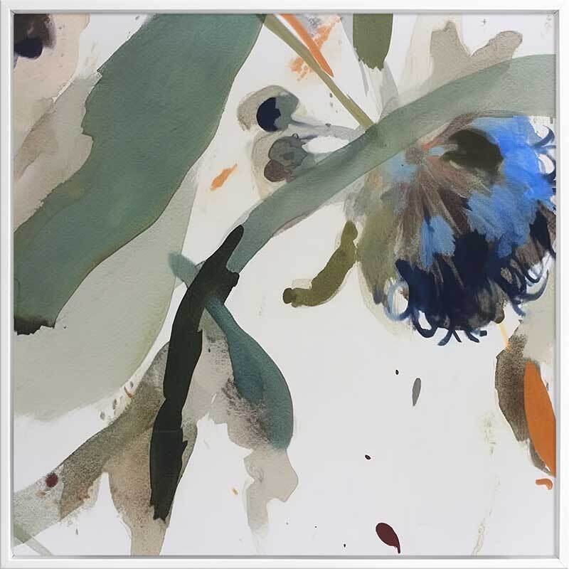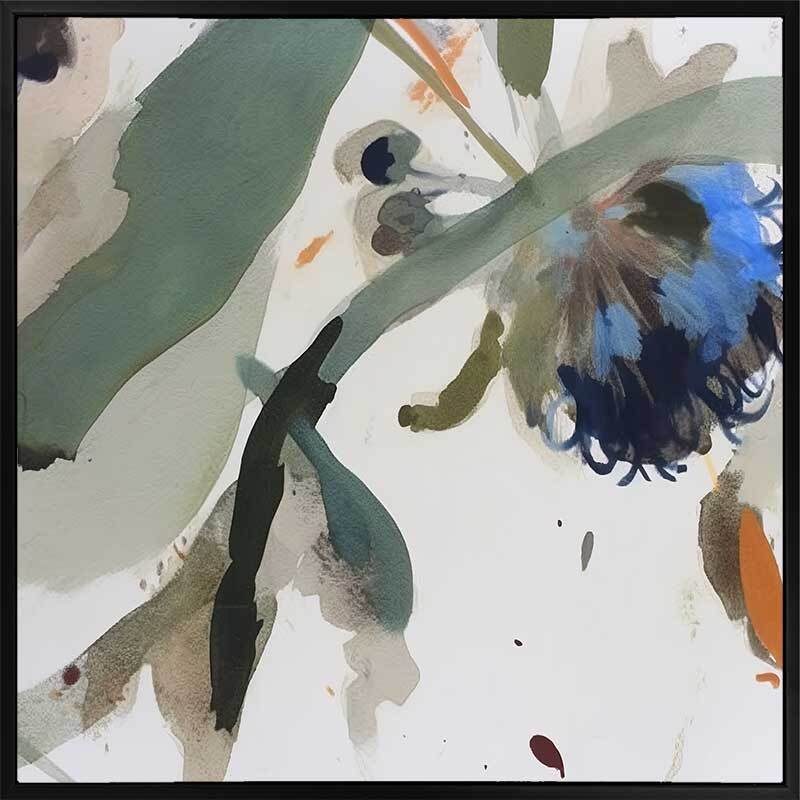 Blue Nectar I Canvas Art Print - Let this floral artwork transform your space with its organic fluidity, where spontaneous brushstrokes dance with shades of blue, green, orange, and grey. Featuring both abstract and watercolour qualities, this piece will seamlessly incorporate with any interior style. Pair with Blue Nectar II and III.