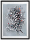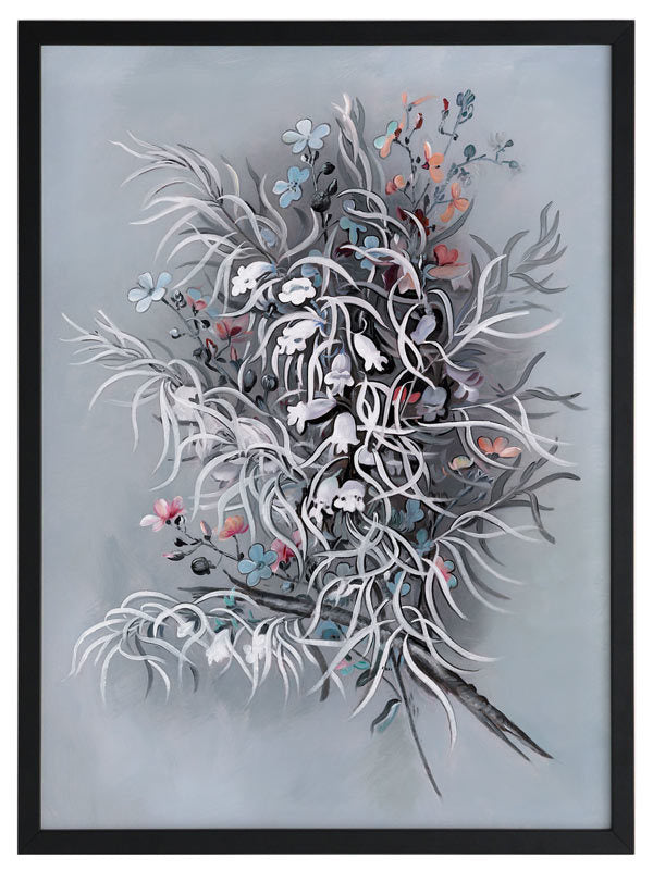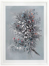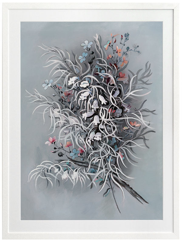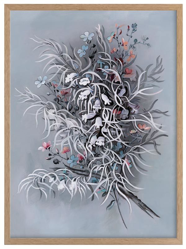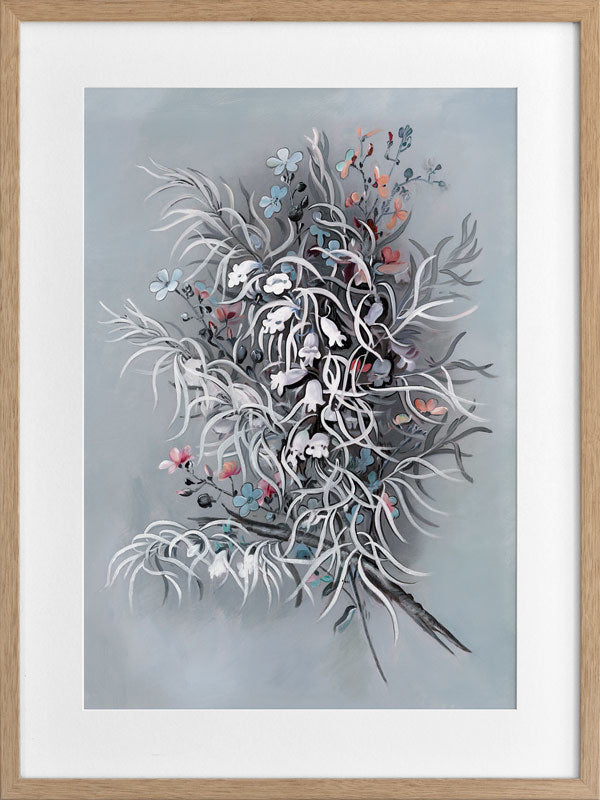Bluebell Framed Print: A beautifully detailed bouquet of Australian natives painted in muted neutral tones with pops of pink, on a soft blue background. 2018 SPRING/SUMMER COLLECTION: REMINISCE
