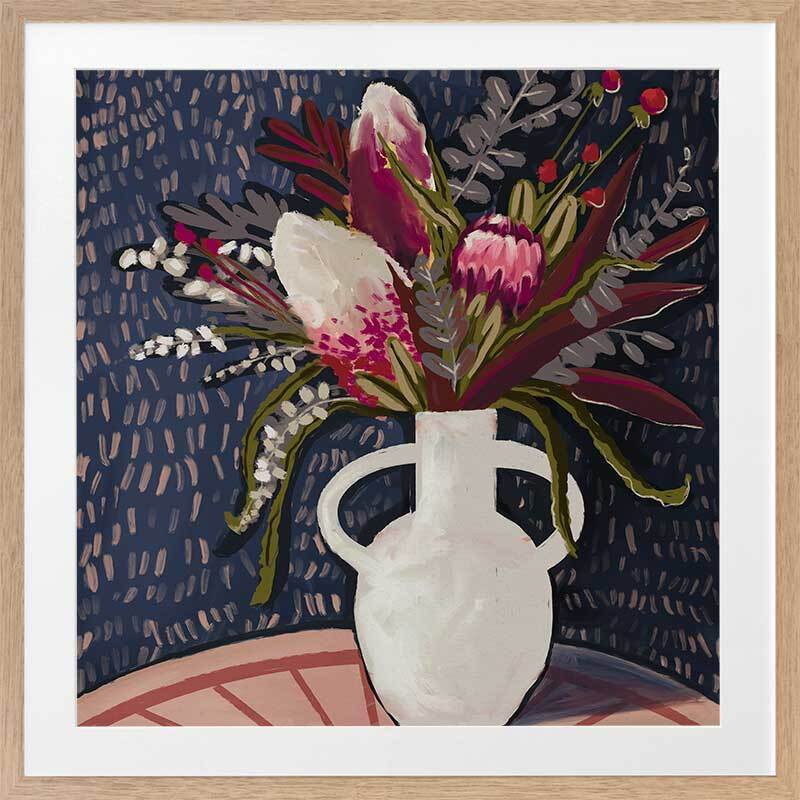 Blushing Blooms Framed Art Print - It's cold and wet outside, but the view from here is all that is needed. This native bouquet still life art piec evokes an understated sense of sophistication. A deep almost velvet like indigo background provides a perfect stage to bring focus to the stunningly elegant vignette of floral pink blooms - from deep crimson to pale blush, this arrangement sits in a simple white vessel. Elevate your space with this breathtaking statement piece.
