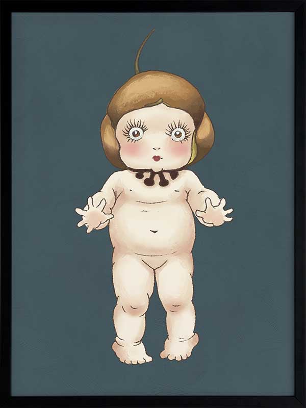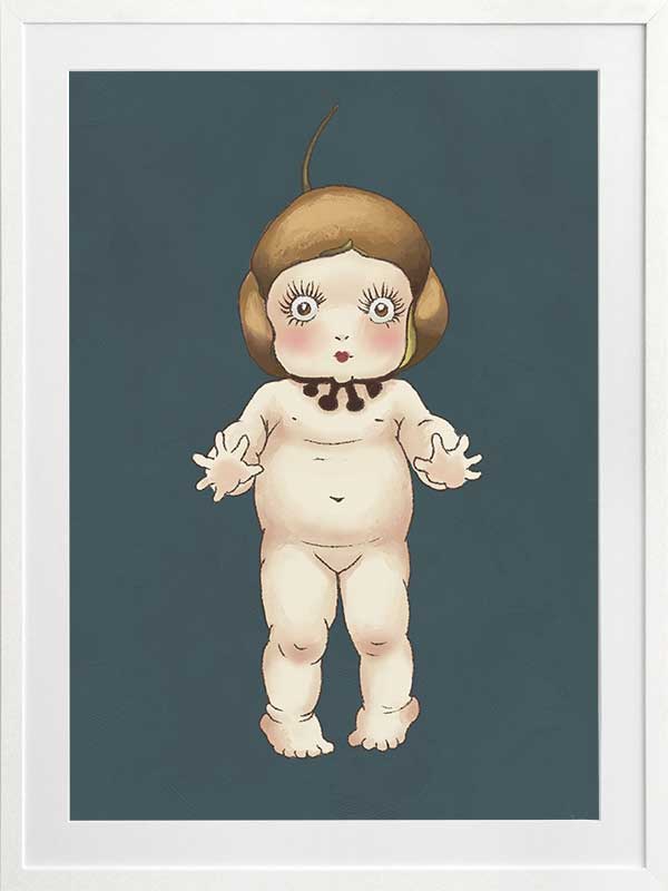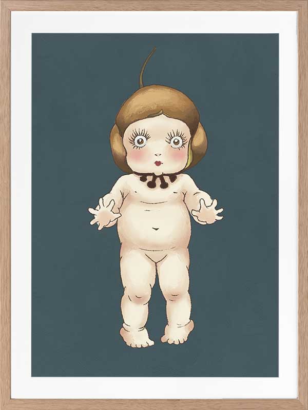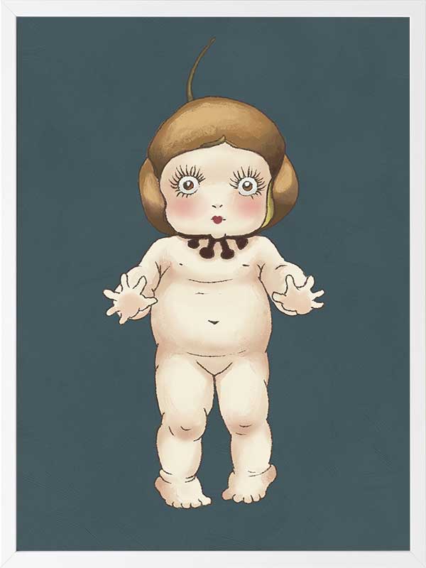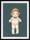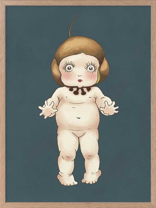 Boronia Baby I Dark Blue Framed Art Print - This adorable design from the Urban Road X May Gibbs Artwork Collection captures the delicate innocence of the beloved Boronia Baby, set against a deep teal backdrop.