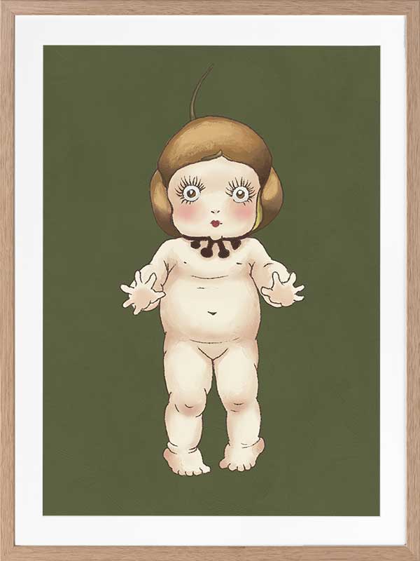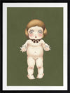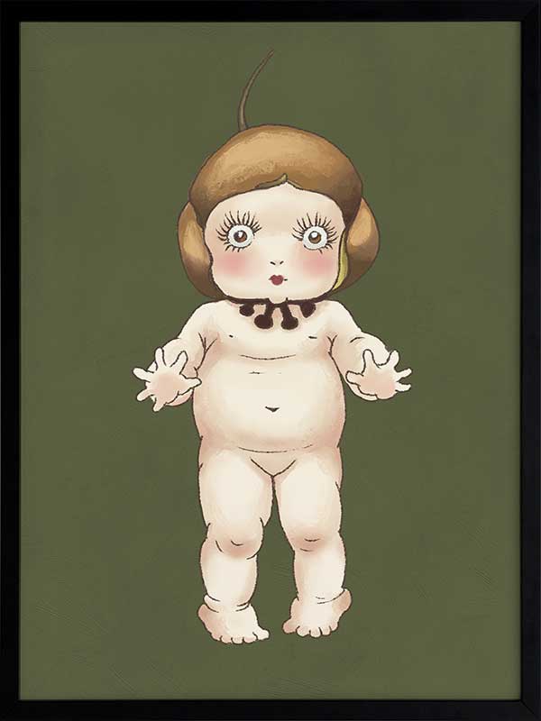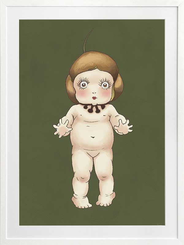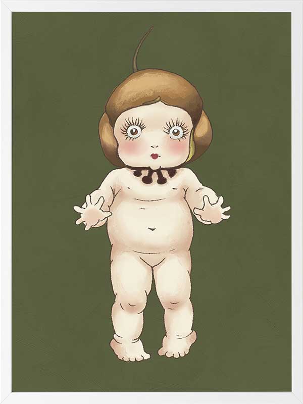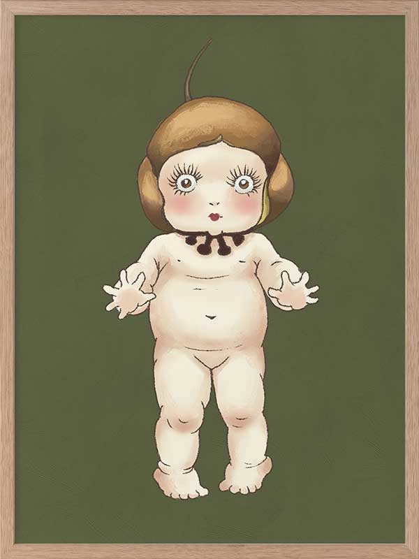 Boronia Baby I Green Framed Art Print - This adorable design from the Urban Road X May Gibbs Artwork Collection captures the delicate innocence of the beloved Boronia Baby, set against a dark green backdrop.
