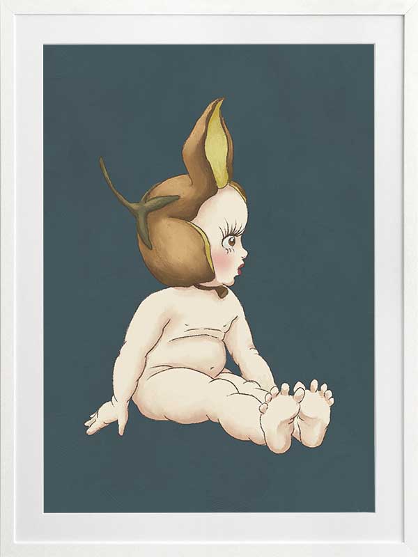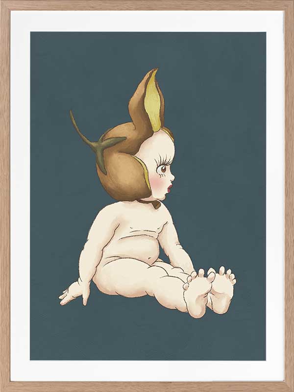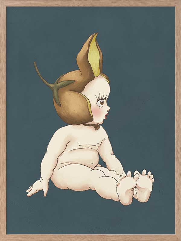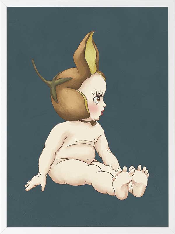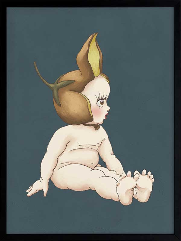 Boronia Baby II Dark Blue Framed Art Print - This delightful piece from the Urban Road X May Gibbs Artwork Collection showcases a Boronia Baby in a quiet moment, its delicate profile framed by a rich teal backdrop that adds depth and sophistication to any space.