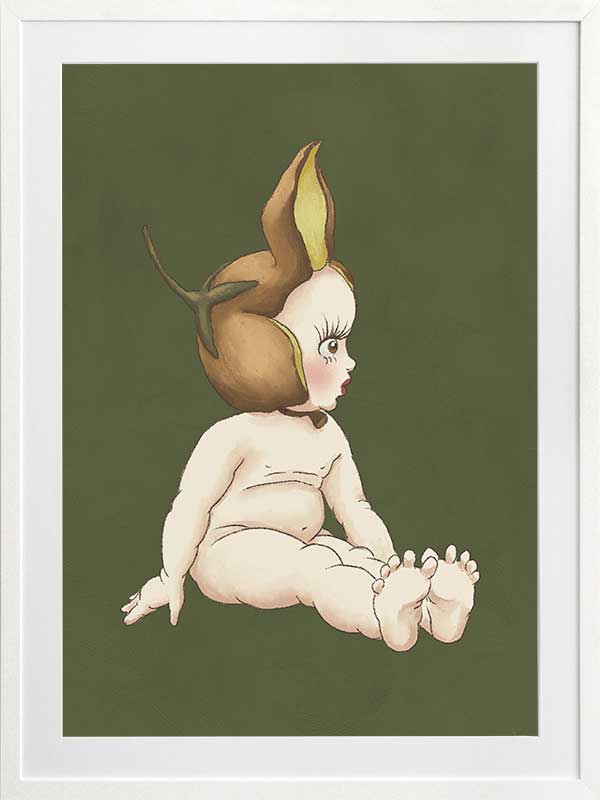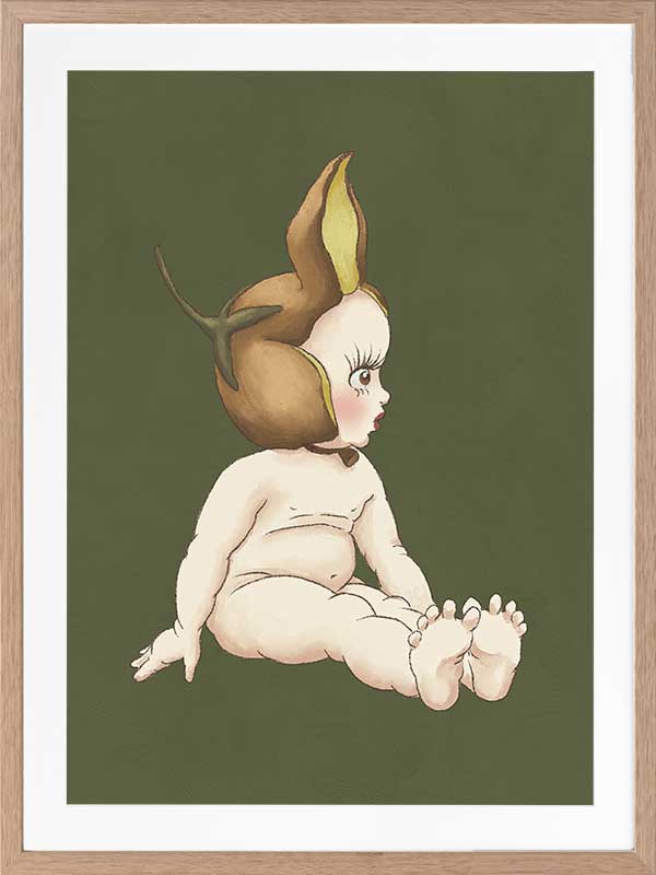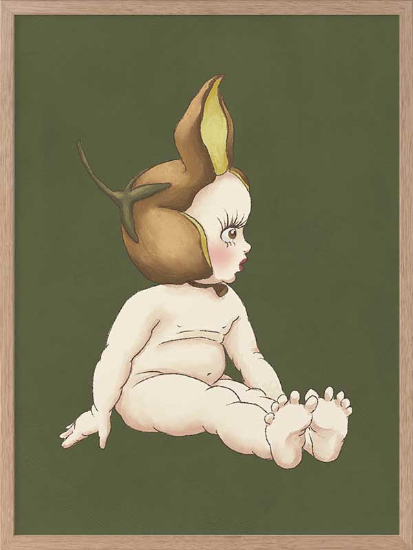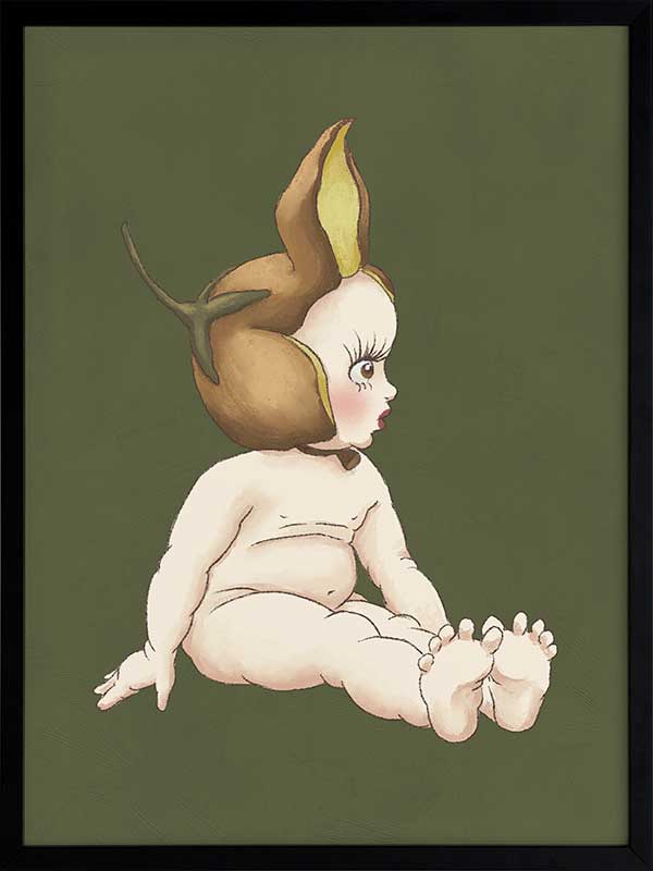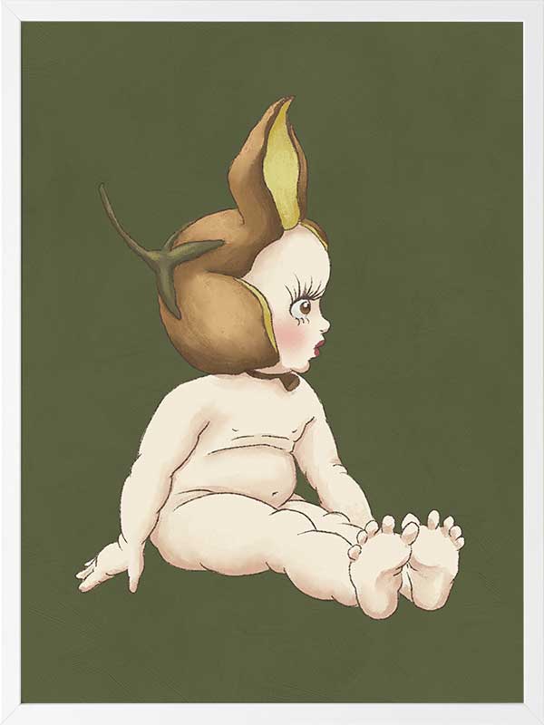 Boronia Baby II Green Framed Art Print - This delightful piece from the Urban Road X May Gibbs Artwork Collection showcases a Boronia Baby in a quiet moment, its delicate profile framed by a rich, dark green backdrop that adds depth and sophistication to any space.