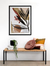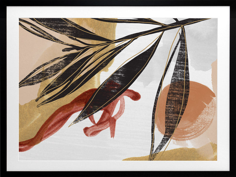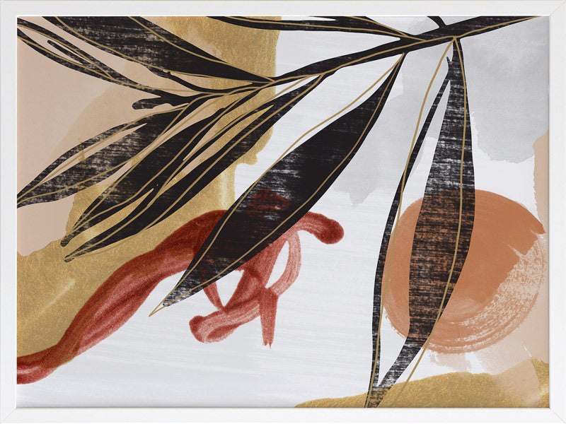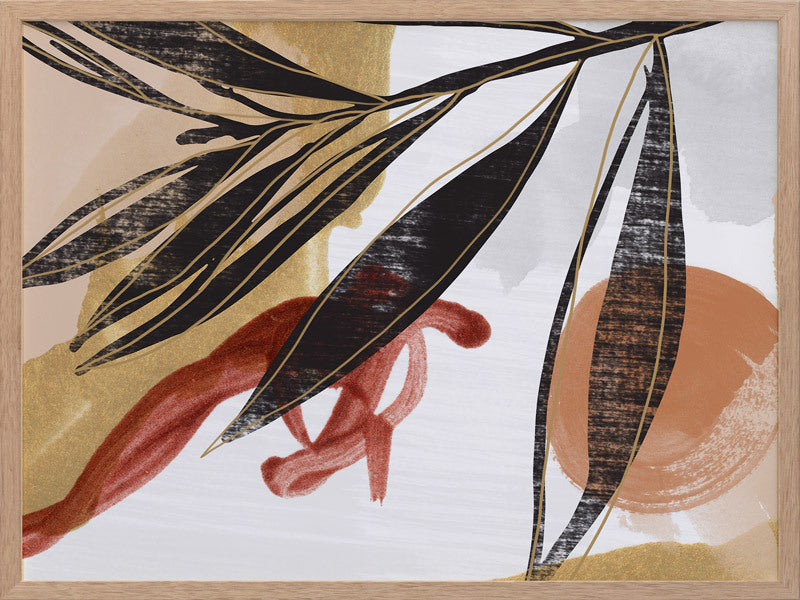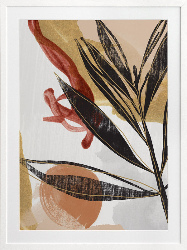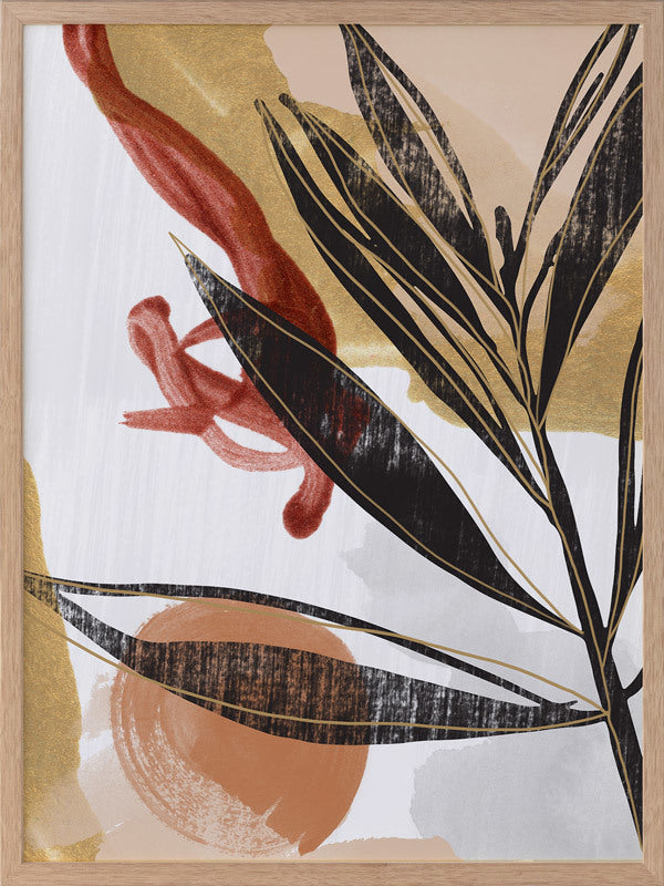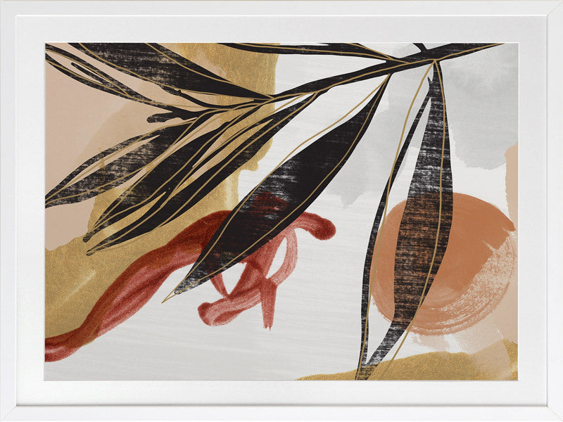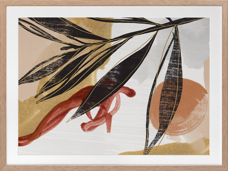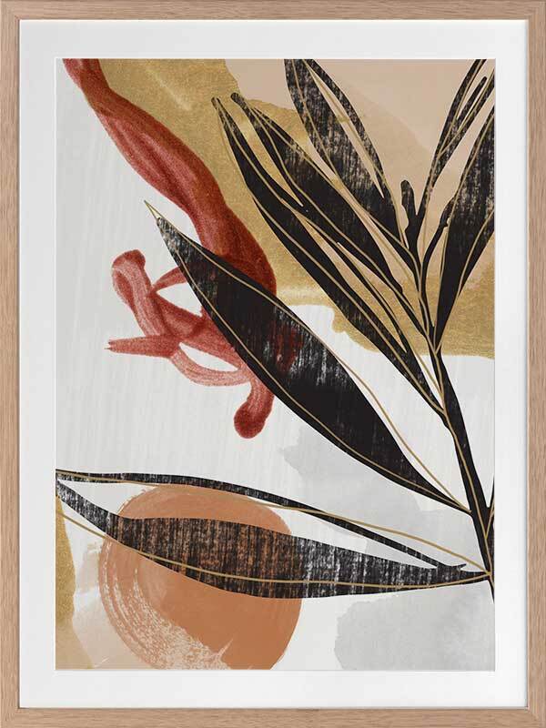 Botanique I Framed Print: A warm, earthy artwork that features a distressed leaf silhouette overlaying burnt orange, red and mustard shapes. Pairs with Botanique II. 2019 AUTUMN/WINTER COLLECTION: ODYSSEY