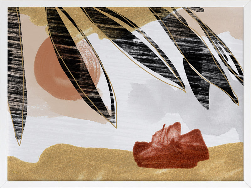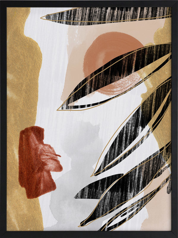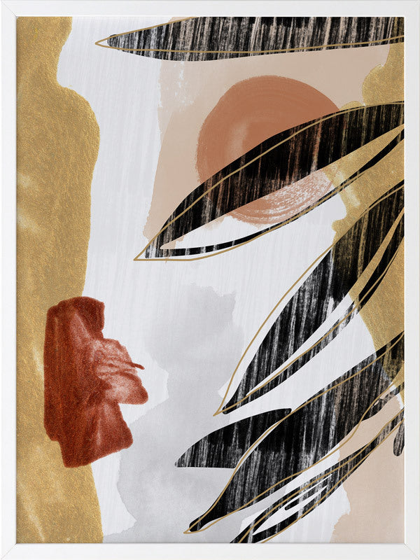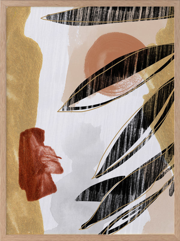 Botanique II Framed Print: A warm, earthy artwork that features a distressed leaf silhouette overlaying burnt orange, red and mustard shapes. Pairs with Botanique I. 2019 AUTUMN/WINTER COLLECTION: ODYSSEY