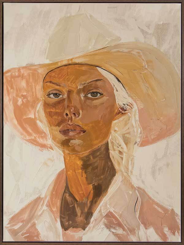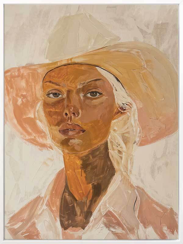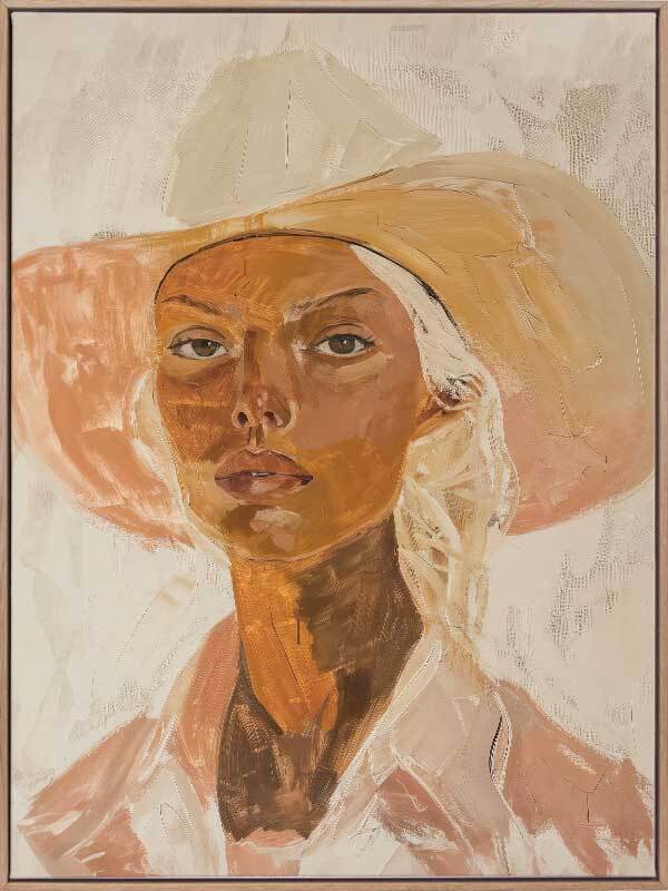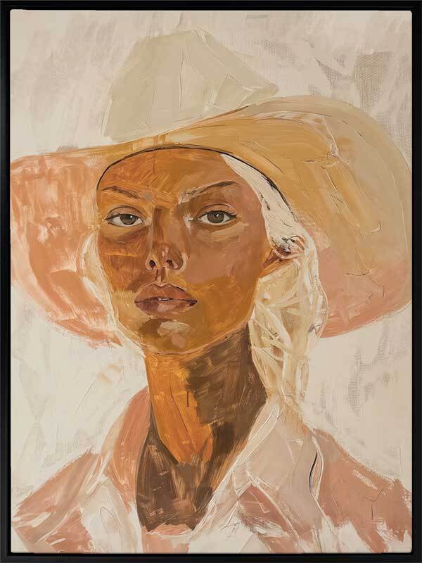 Bravehearted Canvas Art Print - Staring intently and resolute, this country girl wears her favourite cowboy hat and dusty pink collared shirt. A beautifully textured country-themed artwork, this piece features a palette of pale wheat shades with hints of pink and amber, evoking a calming vibe.