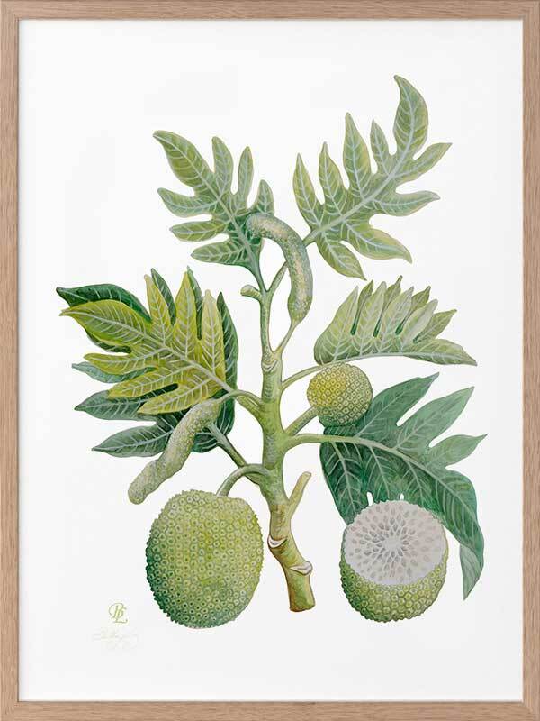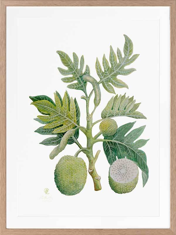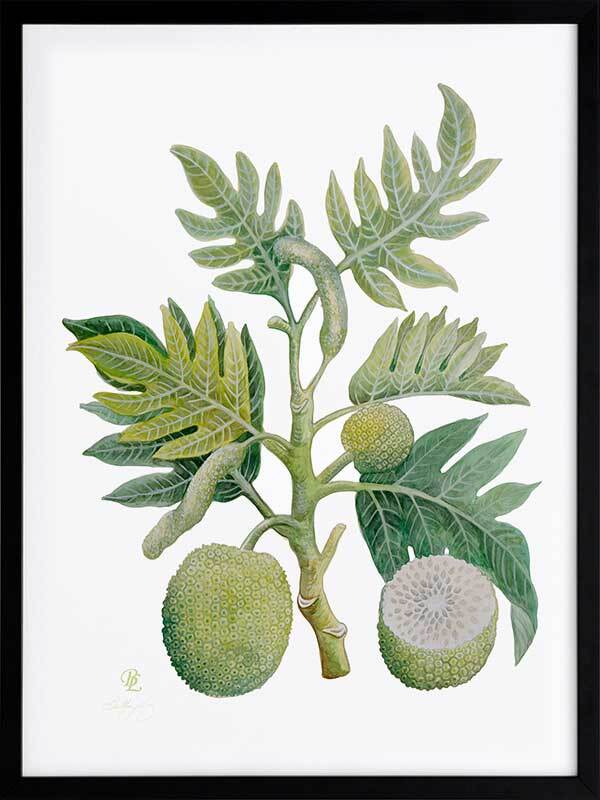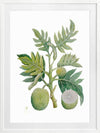 Breadfruit Framed Art Print - An intricate hand painted still life of breadfruit, one or two still attached to their growing branches, another freshly sliced in half. This piece has an intimate feel to it, with detailed linework and colouring using varying green and yellow tones, all against a stark white background to reveal each and every detail.