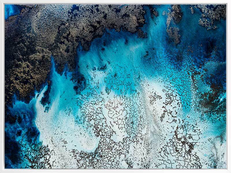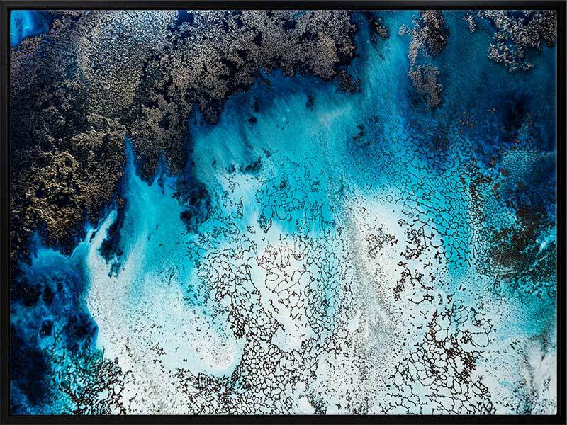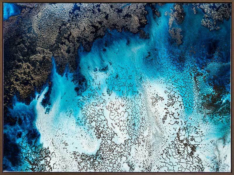 Break Away Canvas Art Print - Moody and textural, this artwork blends vibrant blue and indigo tones with deep, mottled gold and brass accents. A beautiful coastal style piece that mimics an aerial reef.