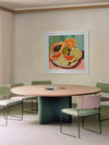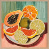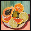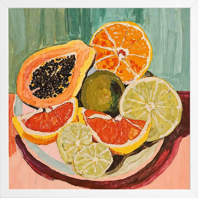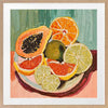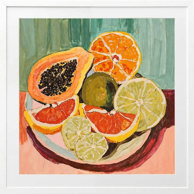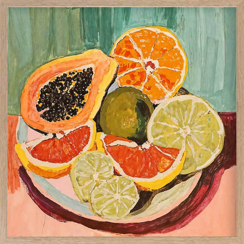 Bright & Juicy Framed Art Print - Your dream kitchen wall art, this piece feels like you can reach right in and grab a fresh, juicy orange, grapefruit, lime, or papaya to eat. A beautifully vibrant and playful Mexican-inspired piece, this artwork features a vibrant palette of warm pinks and burgundy, contrasted by blues and greens.