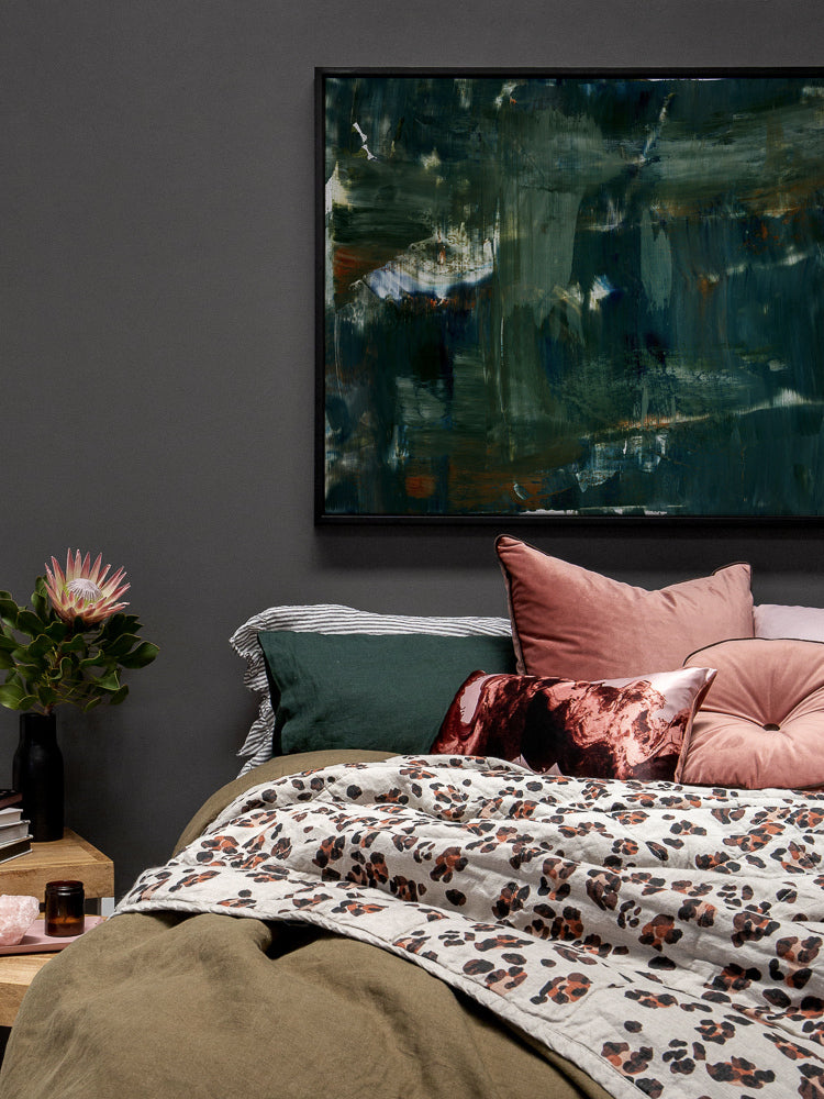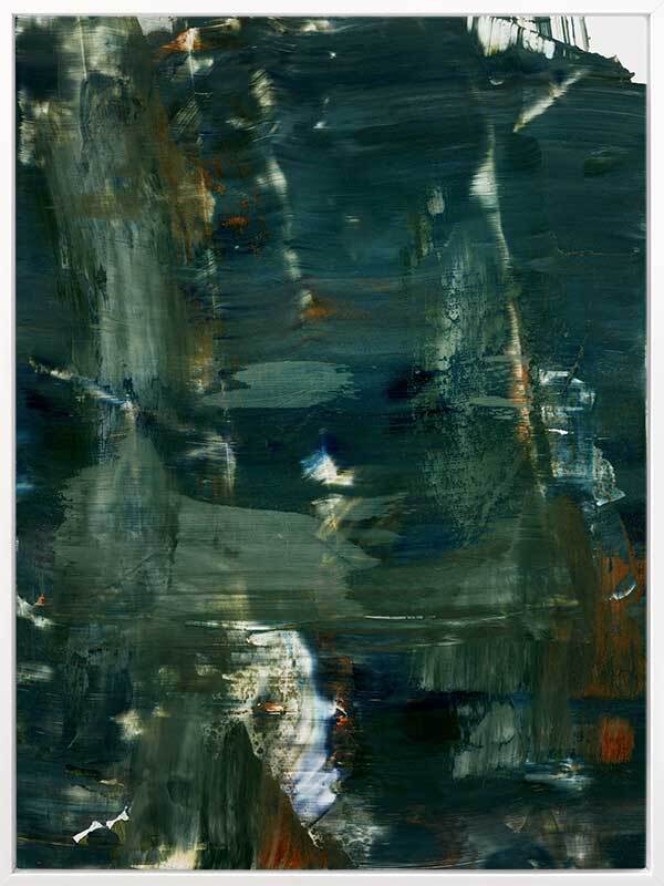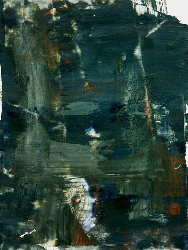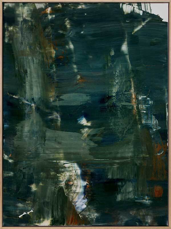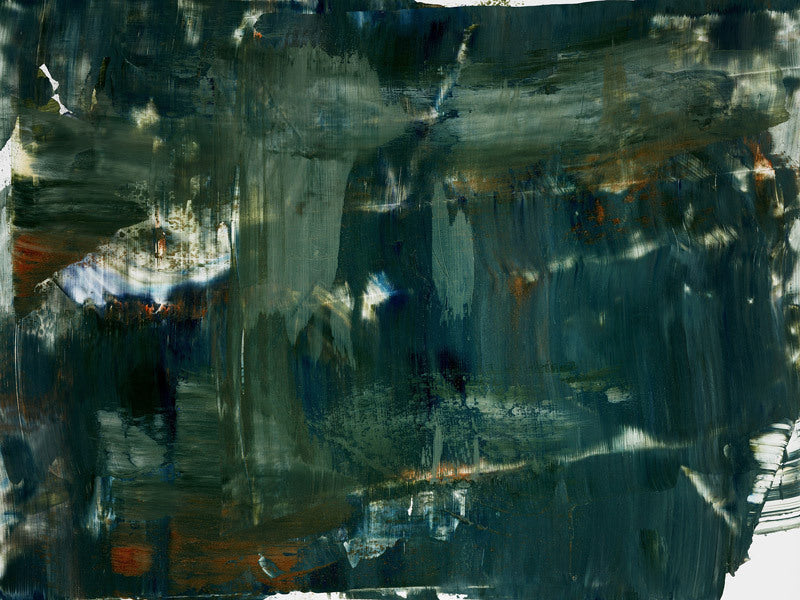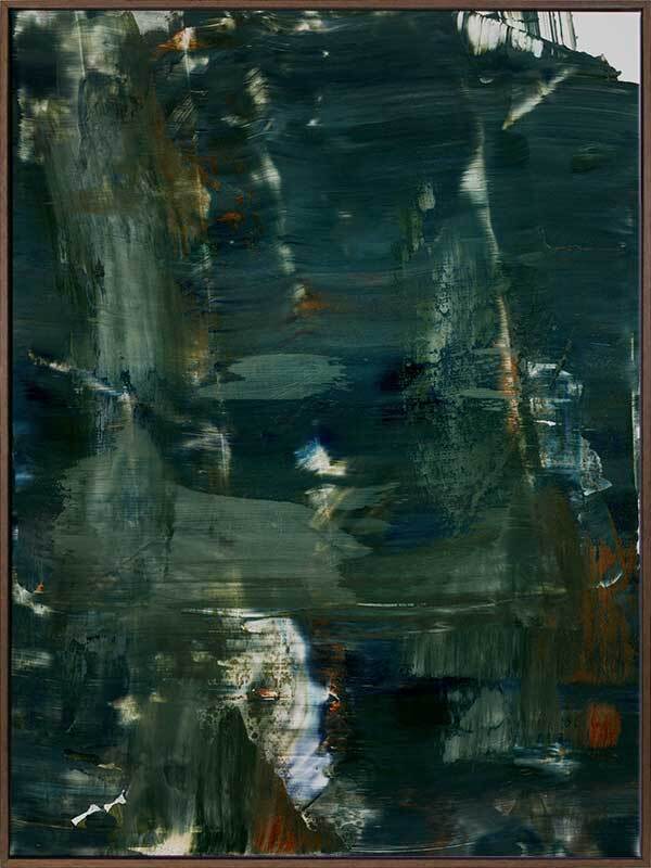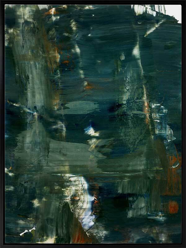 Brokenwood Canvas Art Print: A dark, moody abstract artwork featuring layers of broad squeegee strokes in deep emerald green shades with flecks of blue and brown. 2019 AUTUMN/WINTER COLLECTION: ODYSSEY