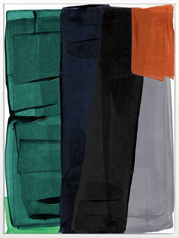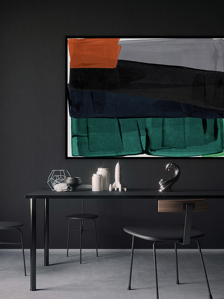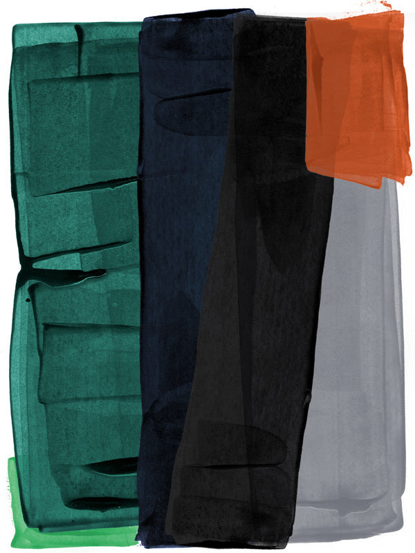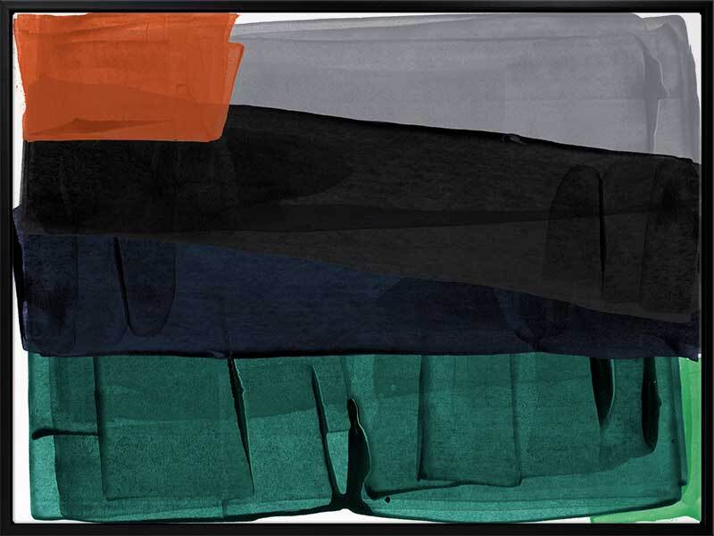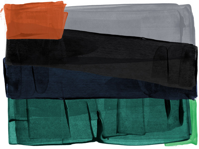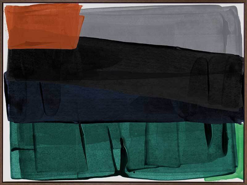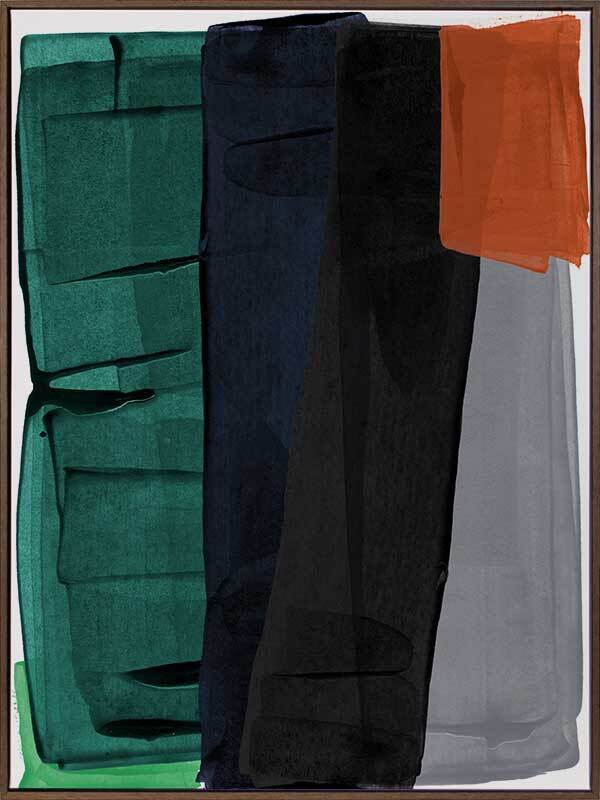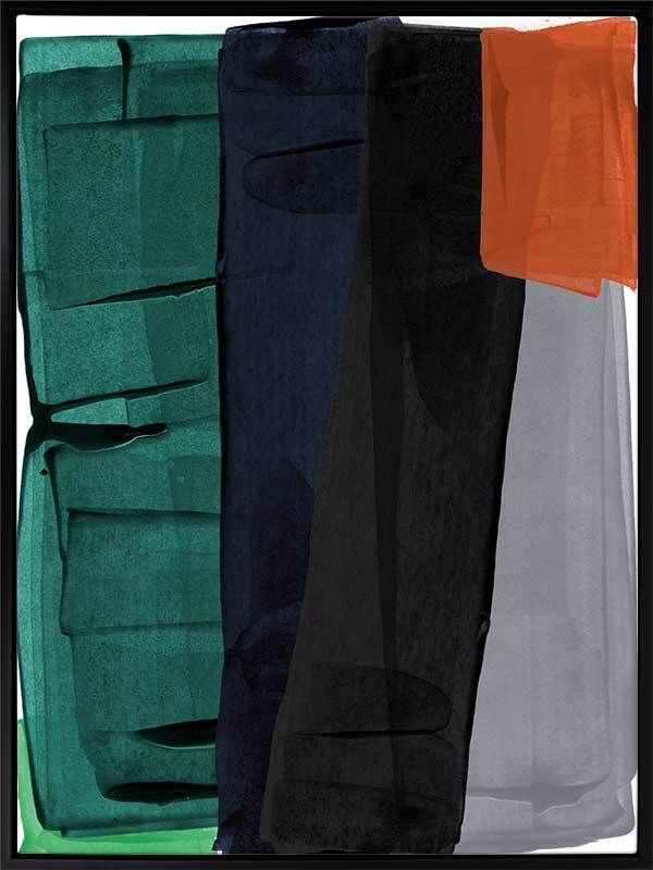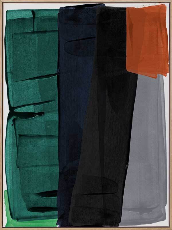 Brooklyn Canvas Art Print: A simple abstract artwork featuring bold, overlaid teal, navy, black, orange and grey paint strokes. 2020 AUTUMN/WINTER COLLECTION: REVERIE