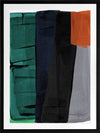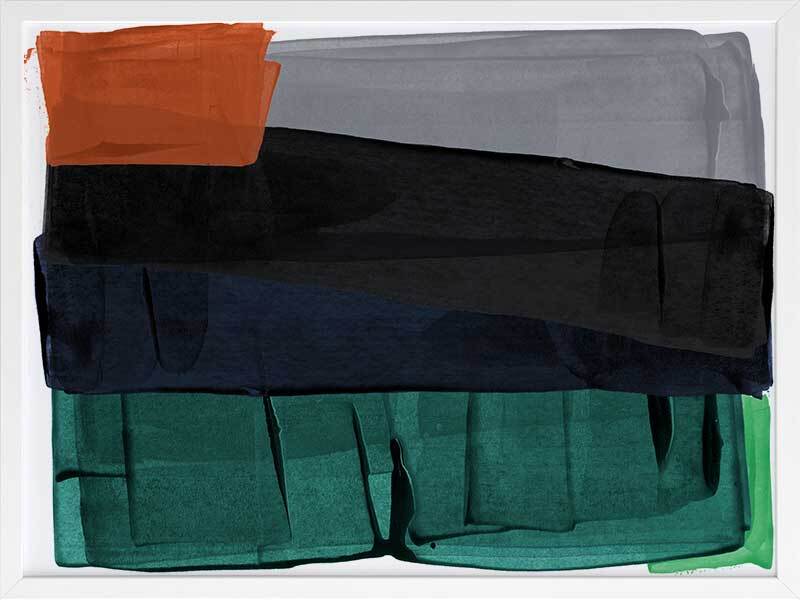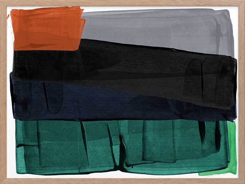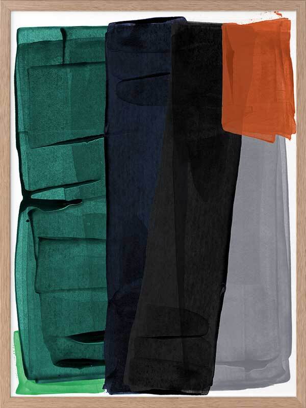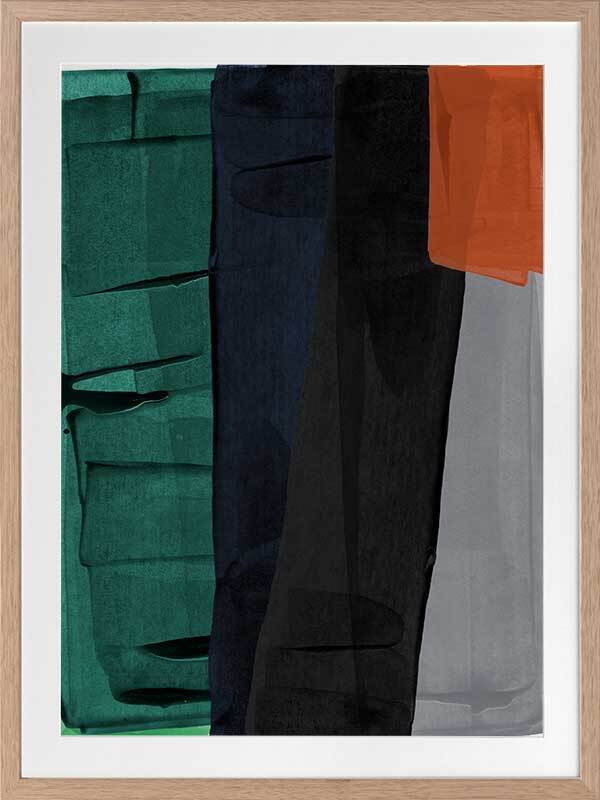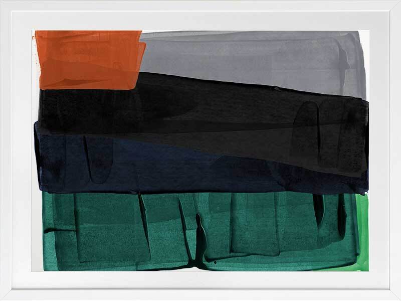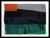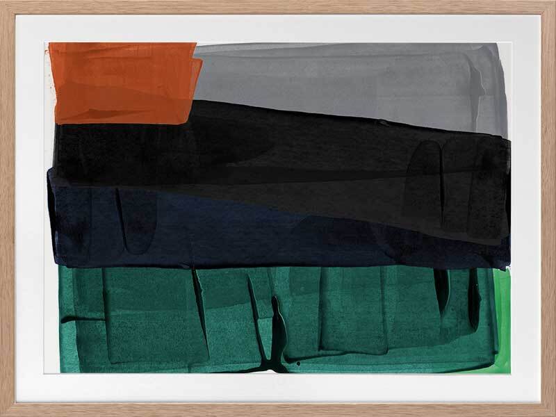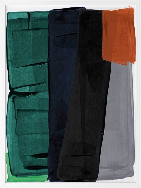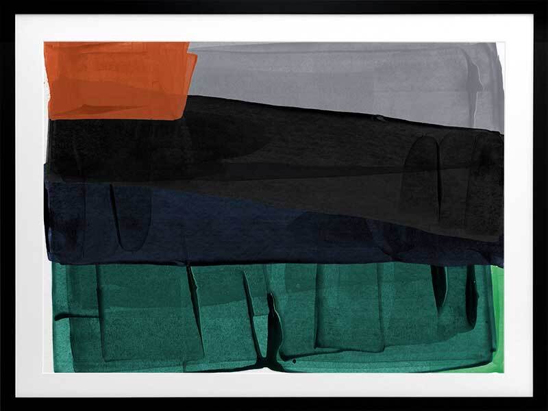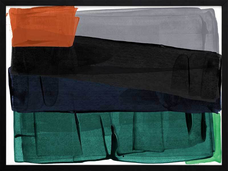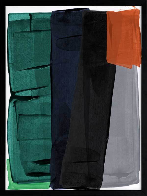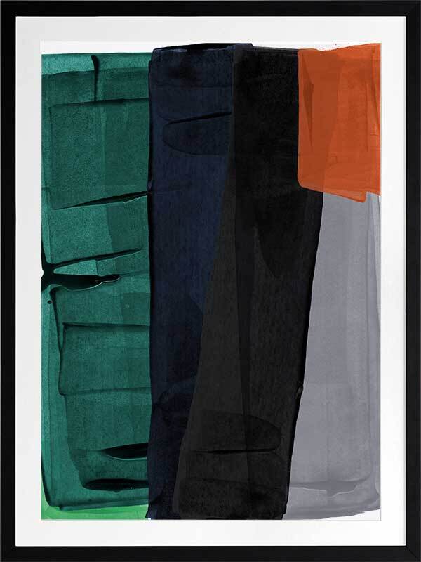 Brooklyn Framed Print: A simple abstract artwork featuring bold, overlaid teal, navy, black, orange and grey paint strokes. 2020 AUTUMN/WINTER COLLECTION: REVERIE