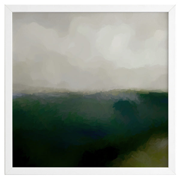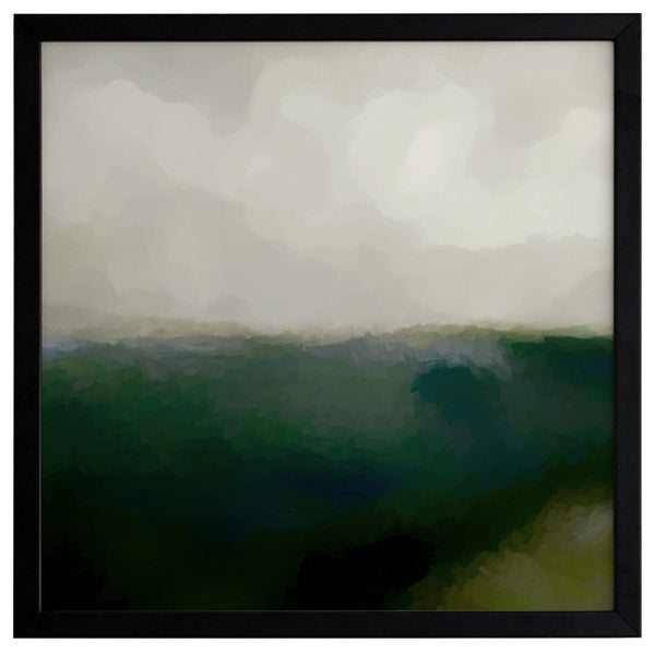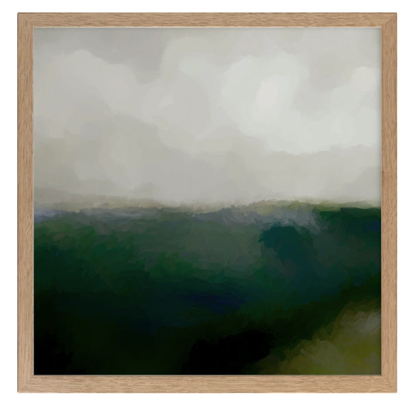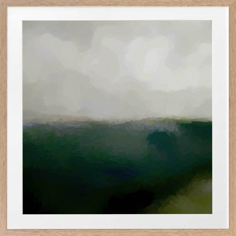 Brumlow Top Framed Print: A tranquil art print of an oil-painted landscape artwork featuring a fresh, green treescape against a soft, grey sky. Pairs with Woodroffe. 2018 SPRING/SUMMER COLLECTION: REMINISCE