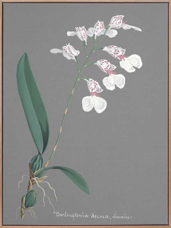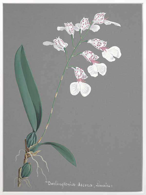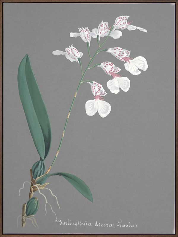Burlingtonia - A vintage nature illustration of a Burligntonia Orchid on a deep grey background.