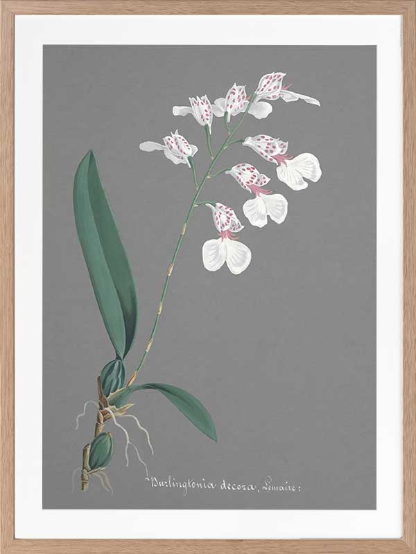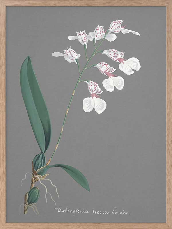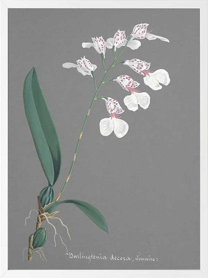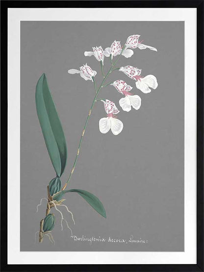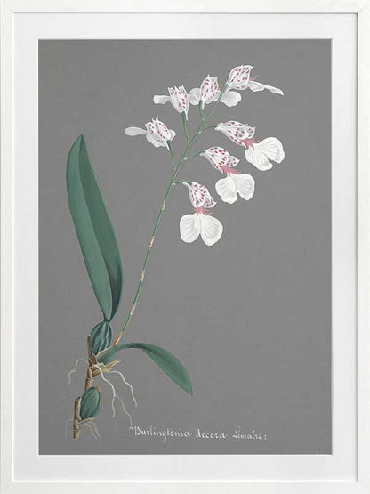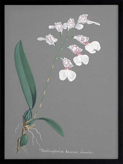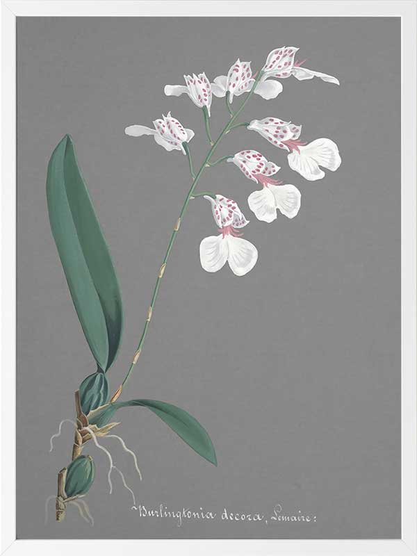 Burlingtonia - A vintage nature illustration of a Burligntonia Orchid on a deep grey background.