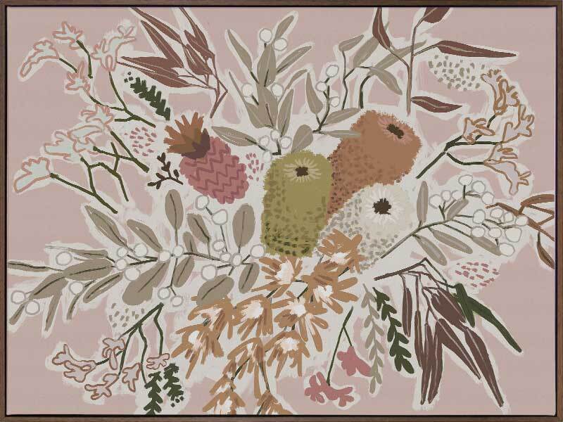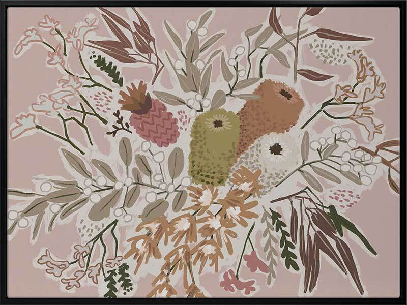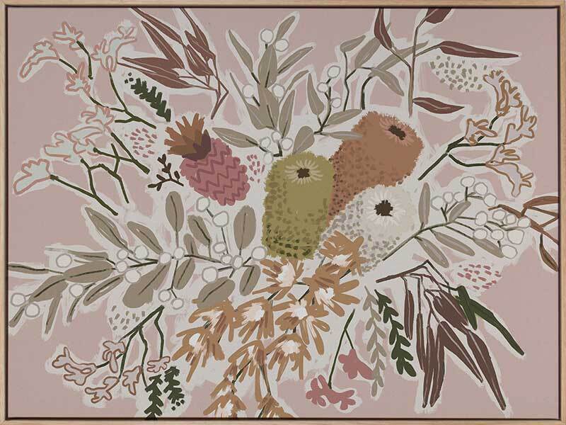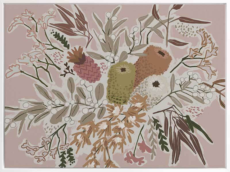 Bush Blooms Canvas Art Print - Muted florals take the stage in this vintage looking artwork, featuring a sparsely arranged bouquet of Australian Natives. Dusty pinks, mauves and neutral beige tones form the colour palette for this grounded yet playful piece.
