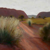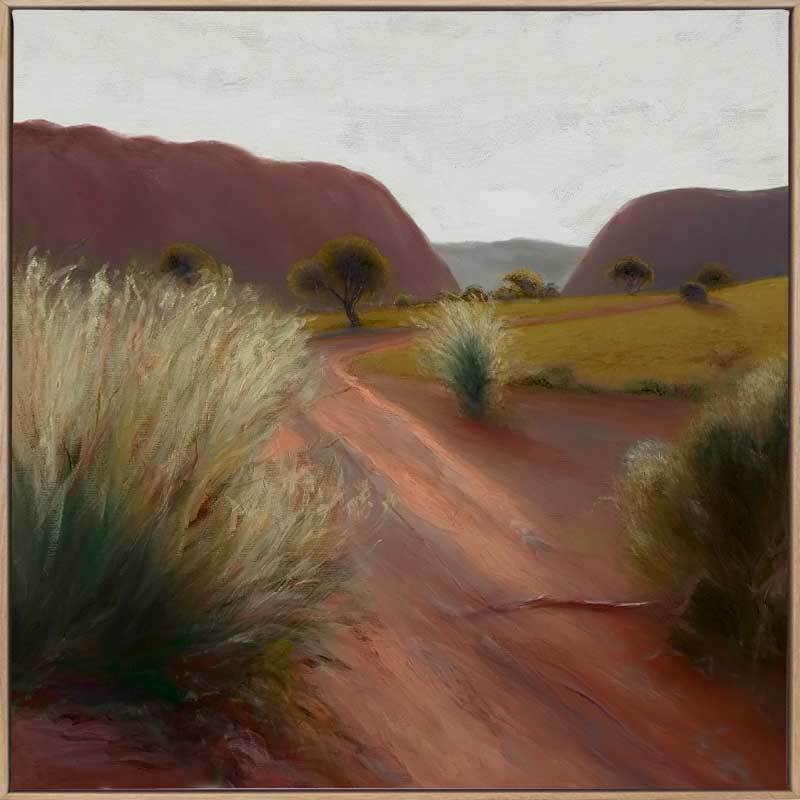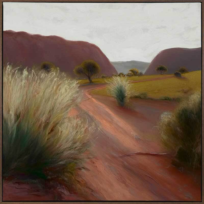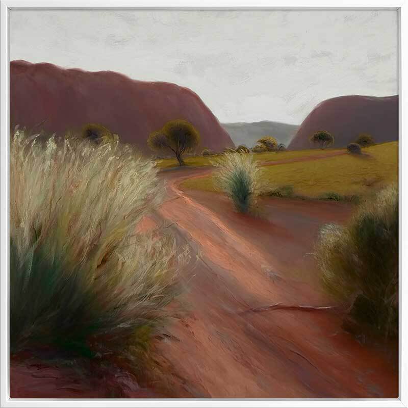 Bushland Beauty Canvas Art Print - A winding red path invites you to explore serene bushland, with gentle hills and whispering trees. This Australian landscape wall art uses earthy, warm tones from deep orange-toned browns to light and dark green for the trees and bushes. Visible brush strokes give a soft, dreamy vibe that evokes calm in your home.