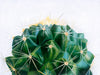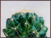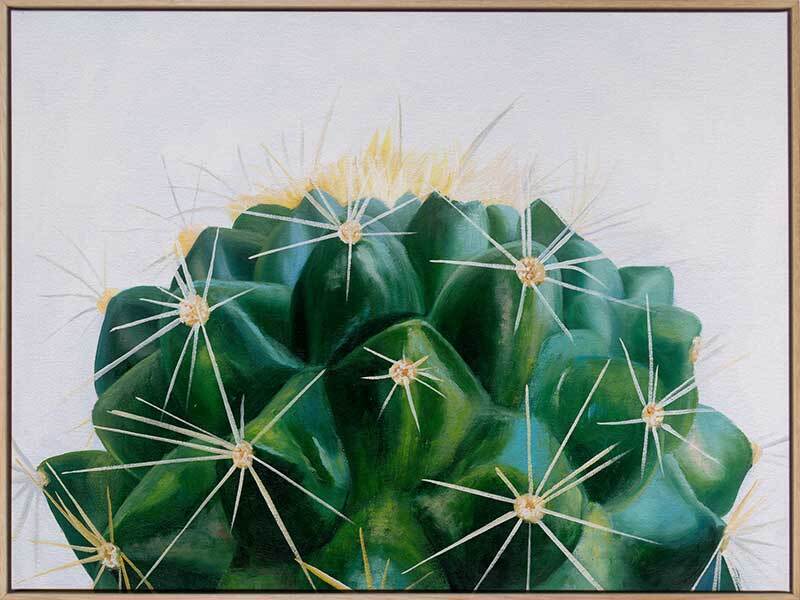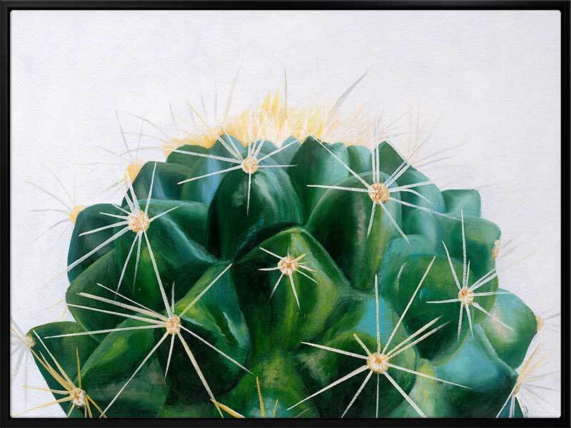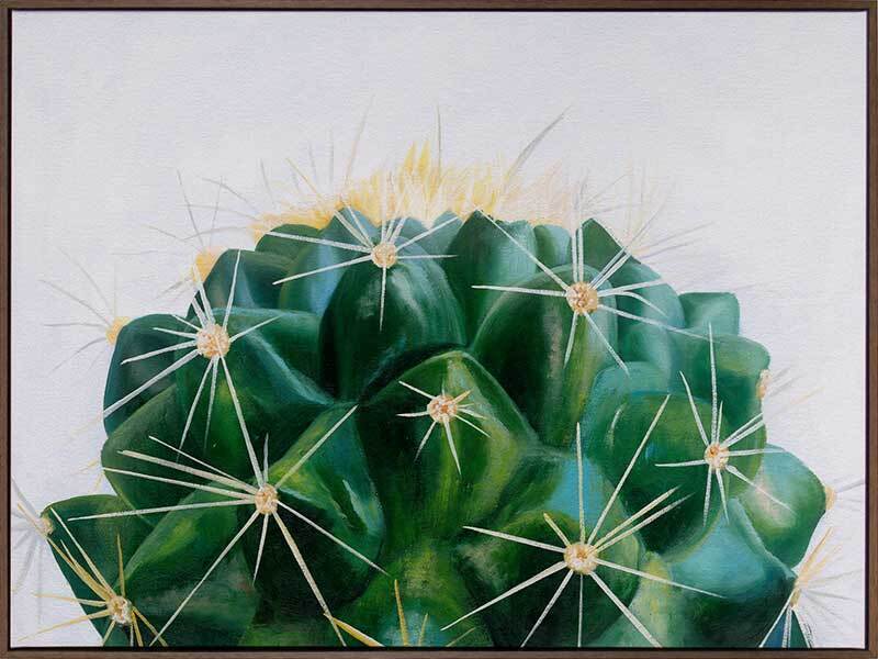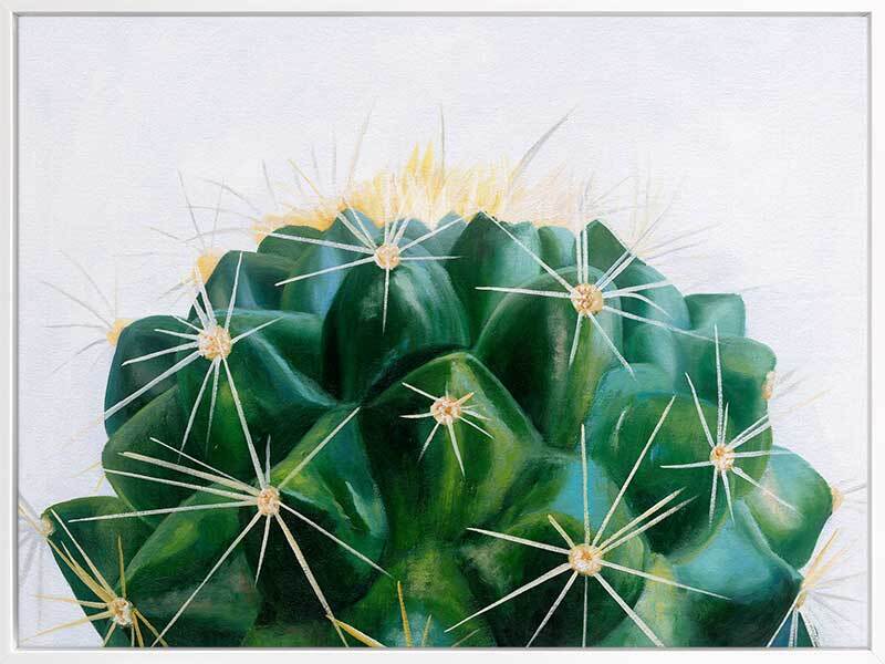 Cacti Canvas Art Print: The interesting perspective of this iconic summer plant showcases the vibrant green of the succulent stem, contrasting starkly with the sharp yellow spines against a clean white background. 2014 SPRING/SUMMER COLLECTION: THE FIRST COLLECTION