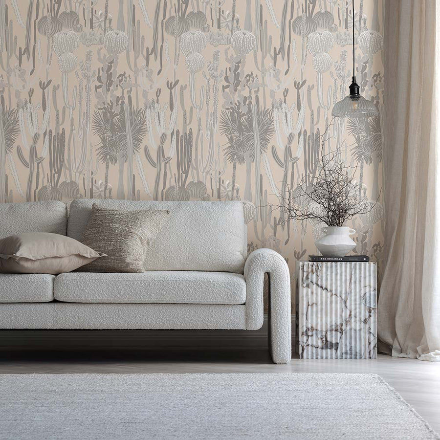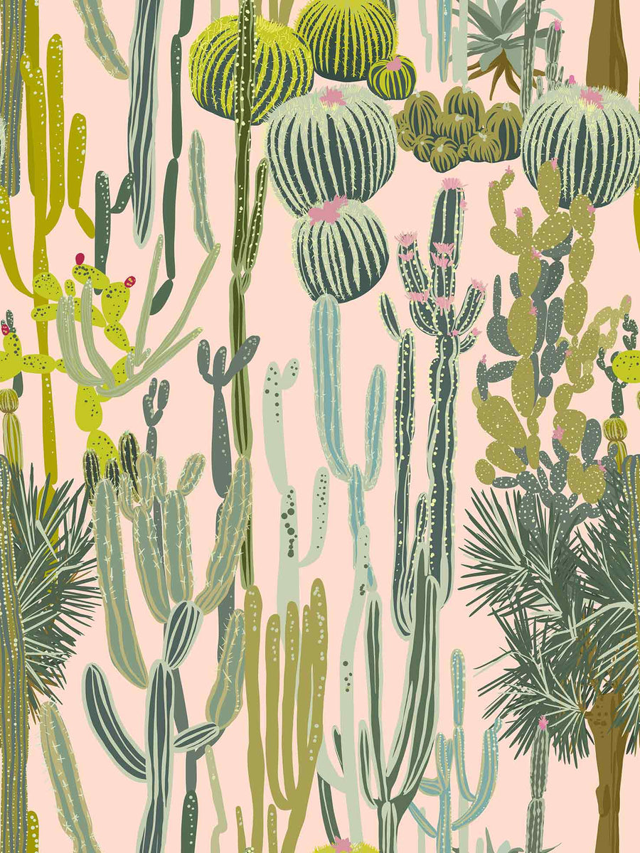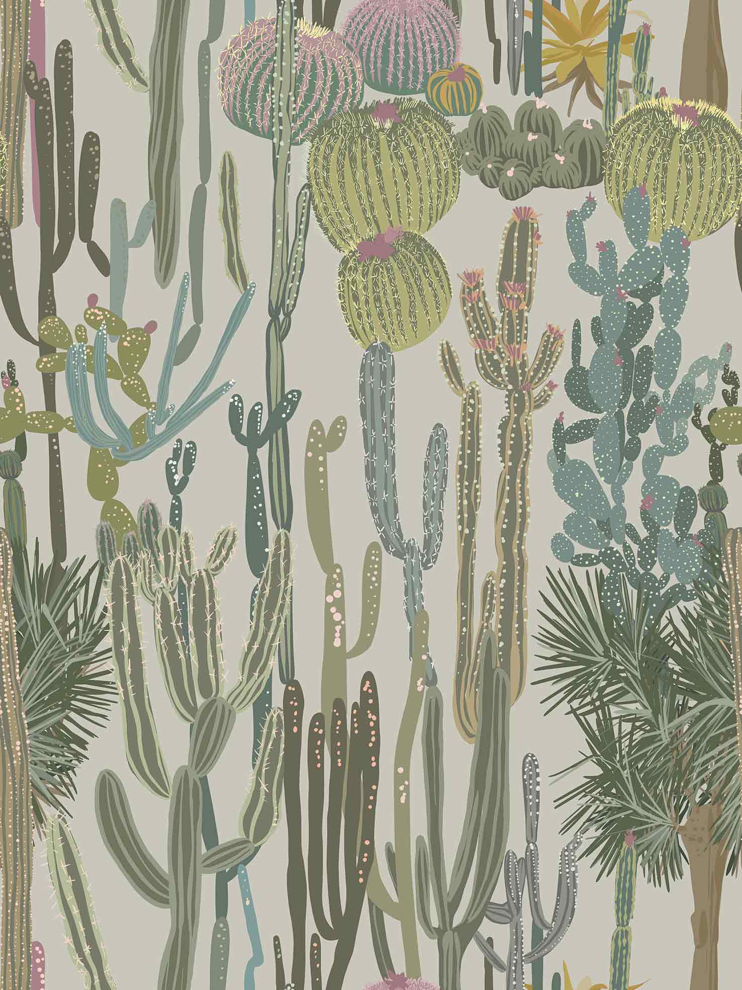 A playful array of cacti, succulents, and desert flora stretches across the design, with a hand-illustrated pattern that brings an adventurous charm - perfect for sparking curiosity and creativity in a kids' room wallpaper.