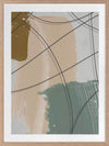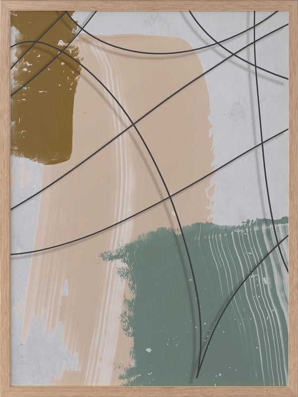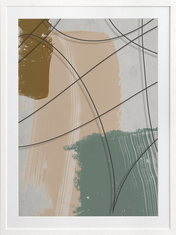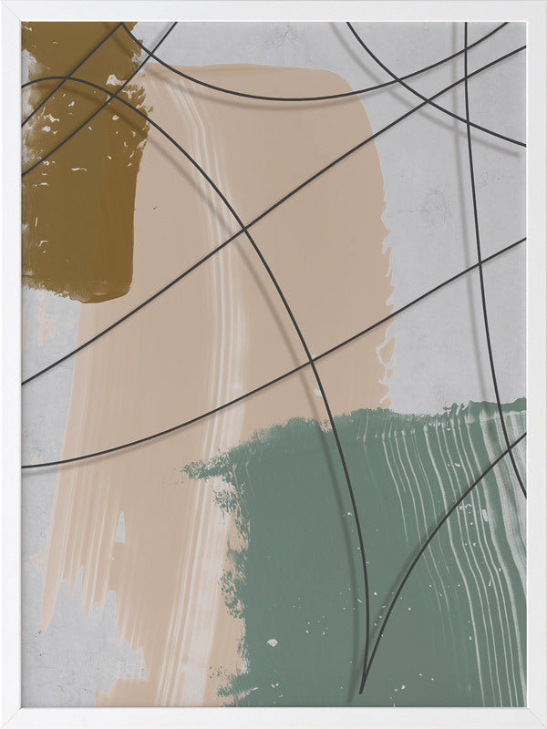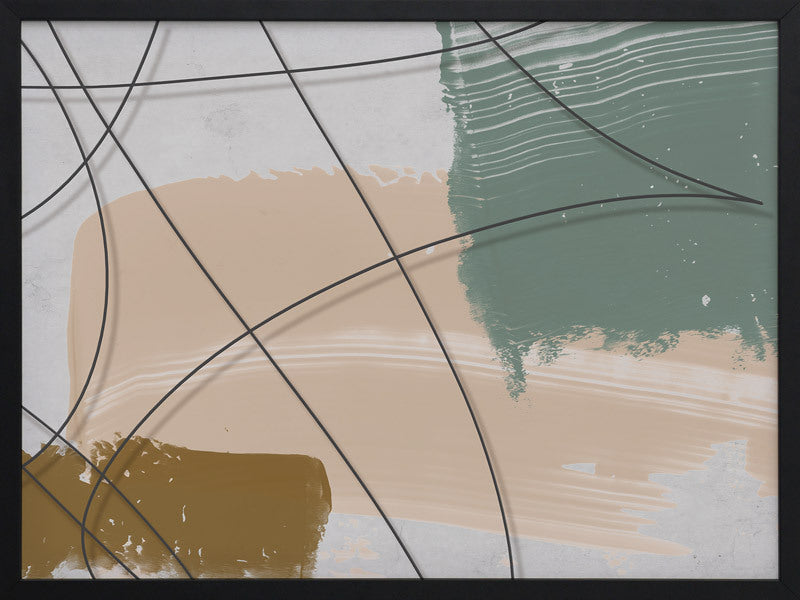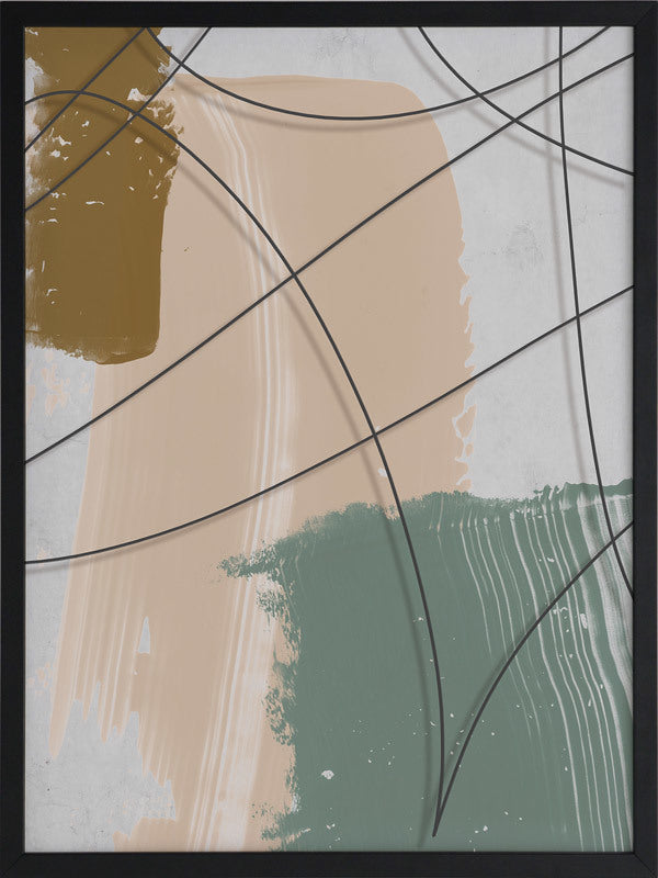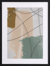Cafe au Lait I Framed Print: A texture-rich, abstract artwork that features a charcoal line overlaying mustard, nude and sage brushstrokes, and a distressed grey background. Pairs with Cafe au Lait II. 2019 AUTUMN/WINTER COLLECTION: ODYSSEY